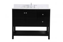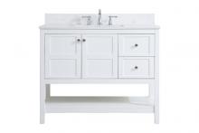 The subtle beauty of the Theo collection 42" vanity in a white finish exudes comfortable luxury. Its modern, yet traditional beauty will surely dress up your bathroom or powder room without any fuss. The white stone countertop and porcelain undermount sink shows quiet opulence, and the legs support upright without fail. Brushed Nickel hardware complements the trendy white finish, with pulls adorning the two cabinet doors and two drawers, showcasing ample storage space within. Slated shelf allows for additional space to organize your towels. Whether this vanity is in your bathroom or for guests, its presence will surely elevate the aesthetics of your room.