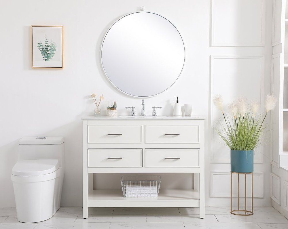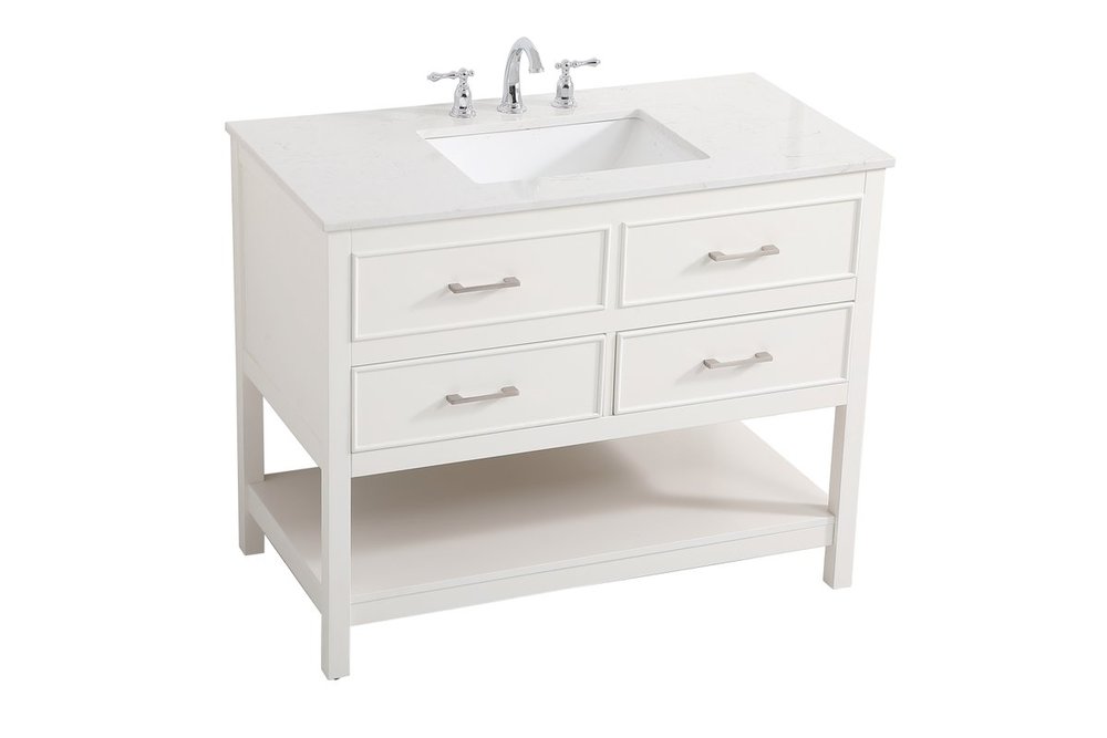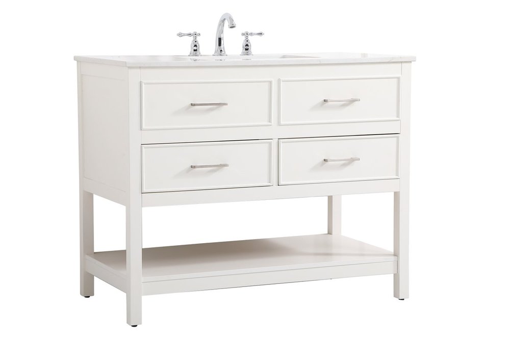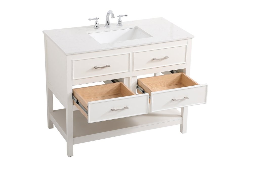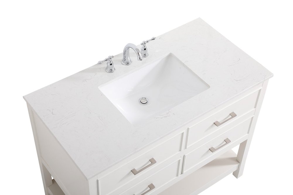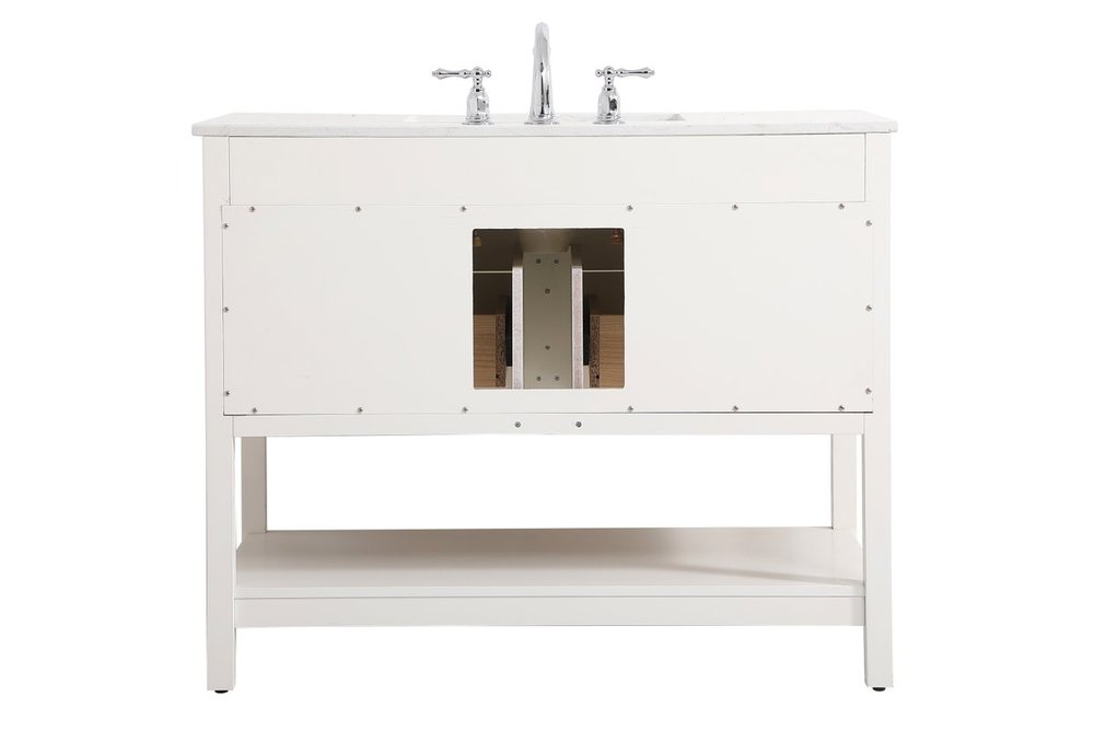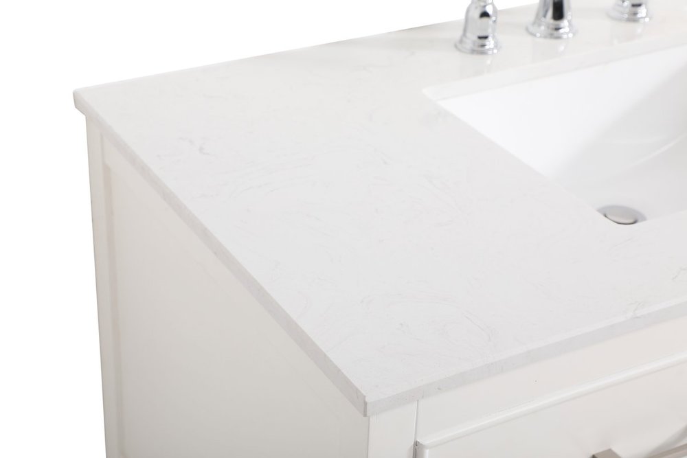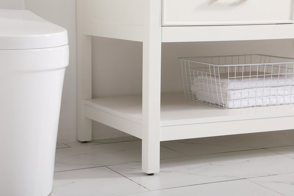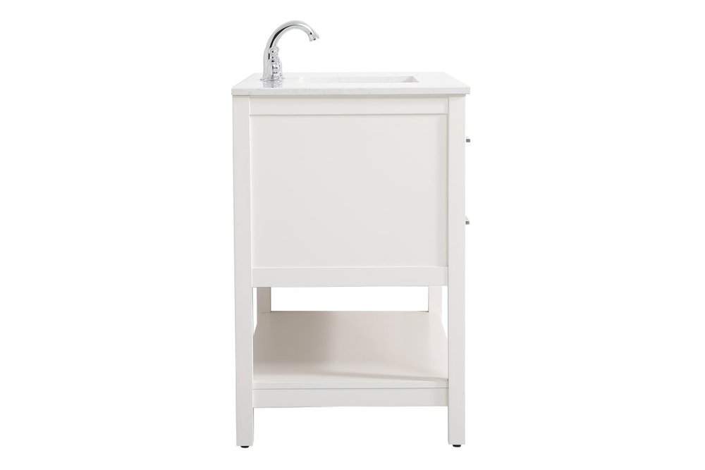 Make the most of your space with this traditional style bathroom vanity. Complements well with many aesthetics with its beautiful finish, calacatta engineered marble countertop, and the contemporary slender handle bar that sits on two upper false drawer and two lower u-shaped drawer, allowing you to store an assortment of bathroom essentials. The lower shelf makes it the perfect space to hold new towels for your guests. This compact vanity ensures both form and function in your bathroom or powder room for you and your guests.