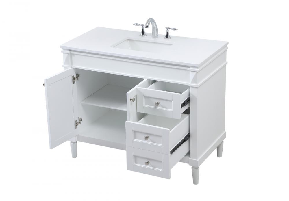 This transitional vanity is a beautiful piece of bathroom furniture will look amazing in your design scheme. The cabinet features a shaker style smooth door panel with simple round knobs and soft close hinges provide ample room for accessories. Packed with multiple side drawers with soft close glides for added comfort and full access to bath supplies. Convenient deep drawer stores all of your tall bath essentials. Constructed of engineered wood and solid wood legs with hand painted finish. The durable engineered marble countertop is a versatile material in an ivory white finish. Minor assembly of the legs needed to get this vanity up and running.