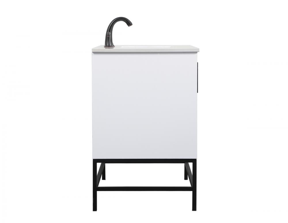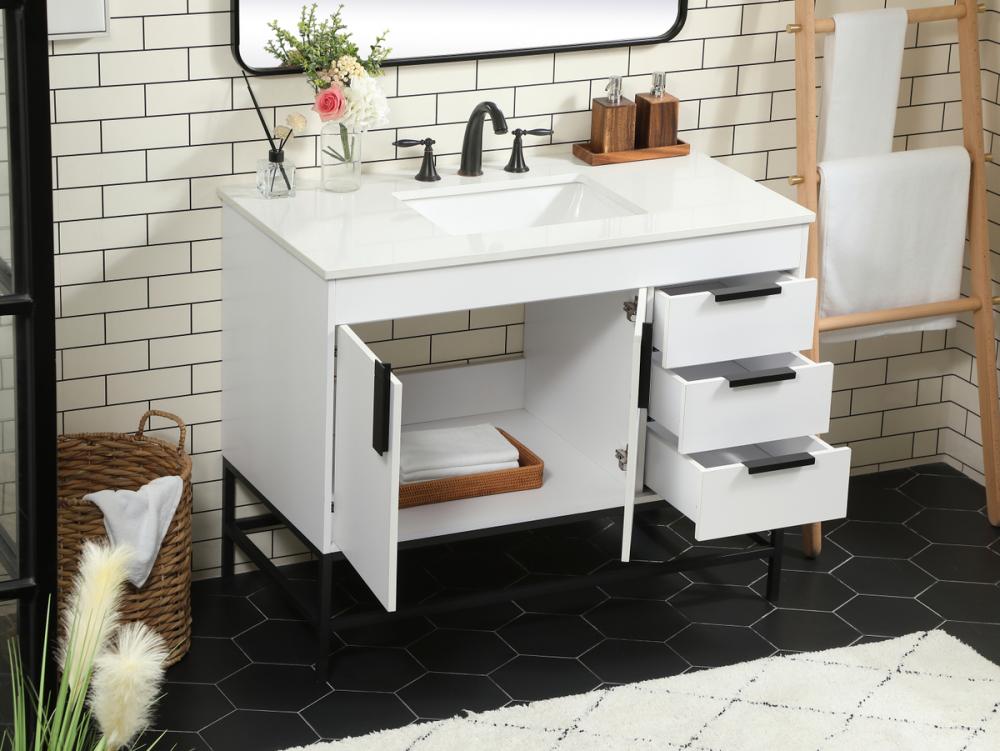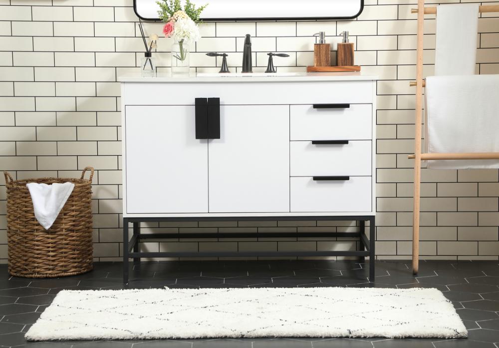 This vanity is a sleek-looking piece of bathroom furniture that is easy to incorporate into your design scheme. The cabinet features a smooth door panel with an oversized steel handle and soft close hinges provide ample room for accessories. Constructed of engineered wood, the powder-coated metal rod legs are an urban industrial look that we love. Minor assembly of the metal legs needed to get this vanity up and running.