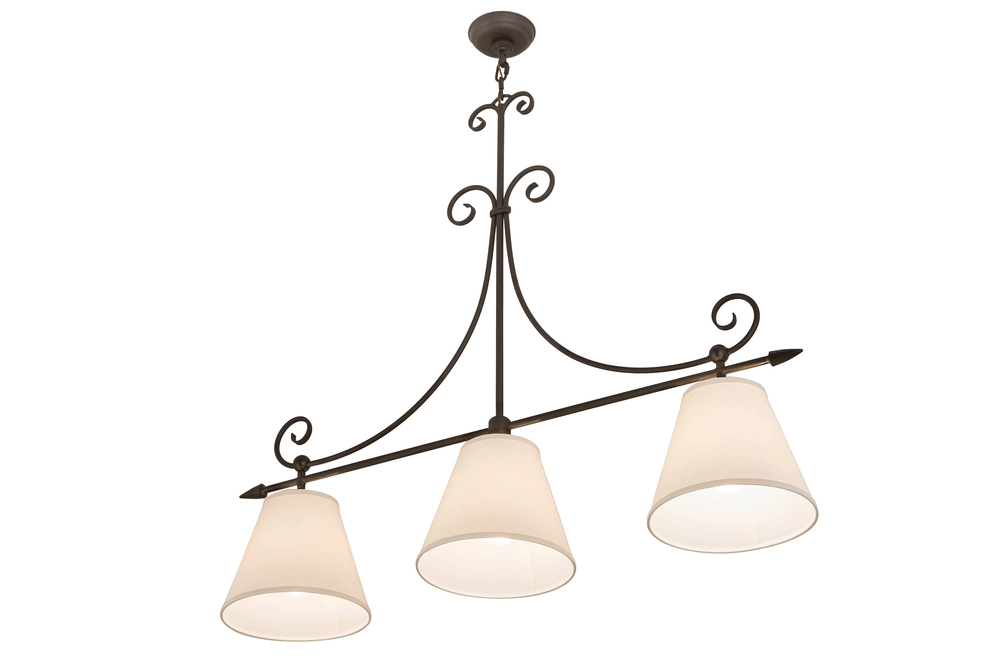 An exquisite oblong pendant presents three stunning Natural Textrene empire styled shades which are accentuated with elegant; fanciful scroll styled metalwork. The frame; decorative accents and hardware are offered in a handsome Oil Rubbed Bronze finish. This oblong pendant is ideal for illuminating dining tables; billiard rooms; reception areas; islands; counters and other fine interiors. Custom crafted at our manufacturing facility in the USA; Marselle is available in custom sizes; styles and colors; as well as dimmable energy efficient lamping options such as LED. The fixture is UL and cUL listed for damp and dry locations.