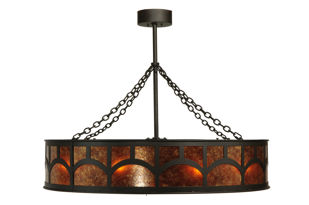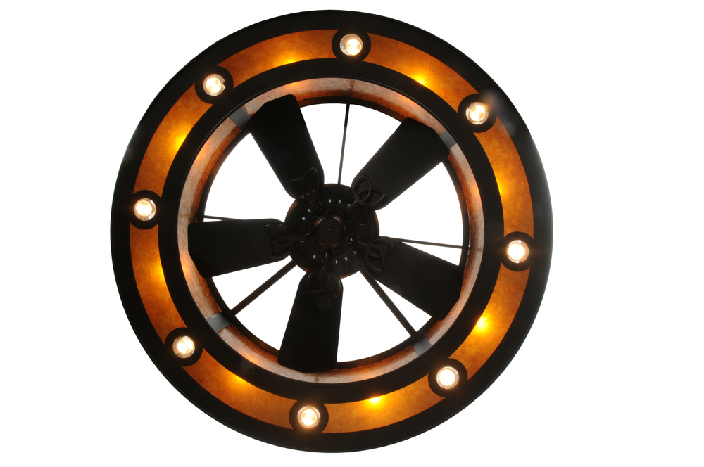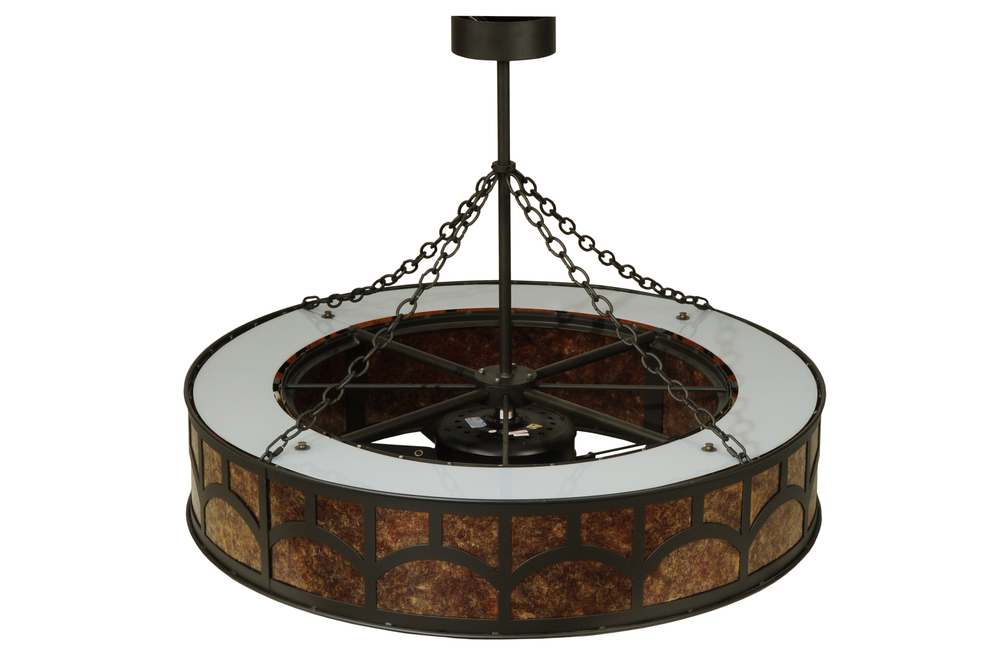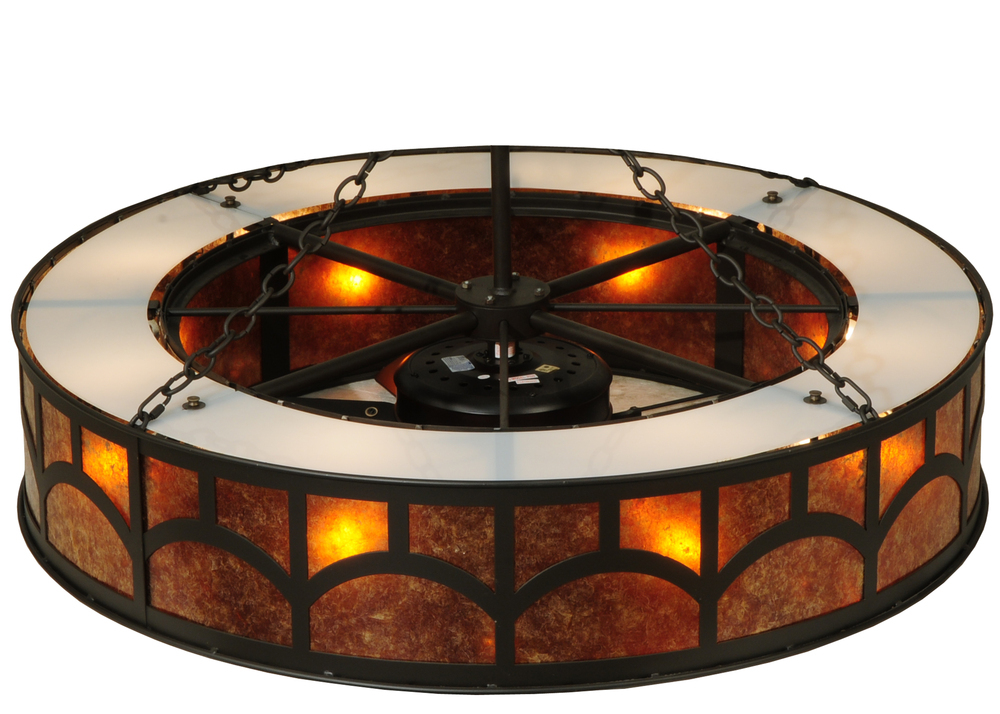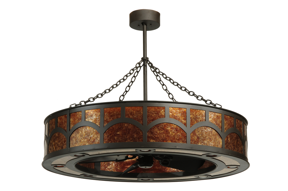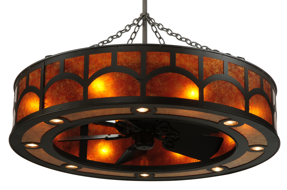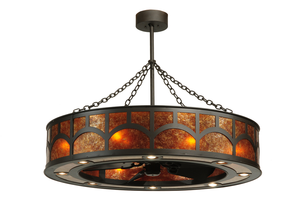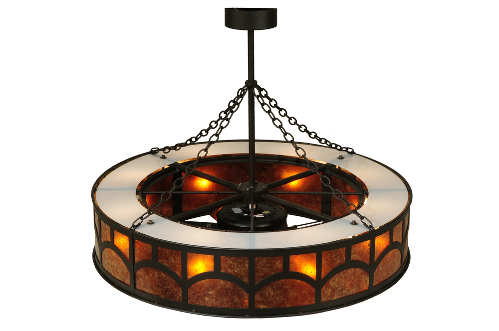 A fan-tastic; energy efficient decorating idea for a home; retail or hospitality location; this unique custom crafted Chandel-Air features an abstract hilltop design on Amber Mica with hardware and accents depicted in an Oil Rubbed Bronze finish. This modern marvel combines a ceiling fan with a handsome lighting fixture that includes eight inner lights for decorative illumination and eight down lights for task lighting. This fixture is handcrafted in Yorkville; New York by Meyda artisans. In summer; the fan pushes down a windchill that circulates to keep the space cool and comfortable. In winter; the fan is reversed to pull the room air up towards the ceiling and force the warm air back down and circulate to create warmth. Custom sizes; styles and colors are offered.