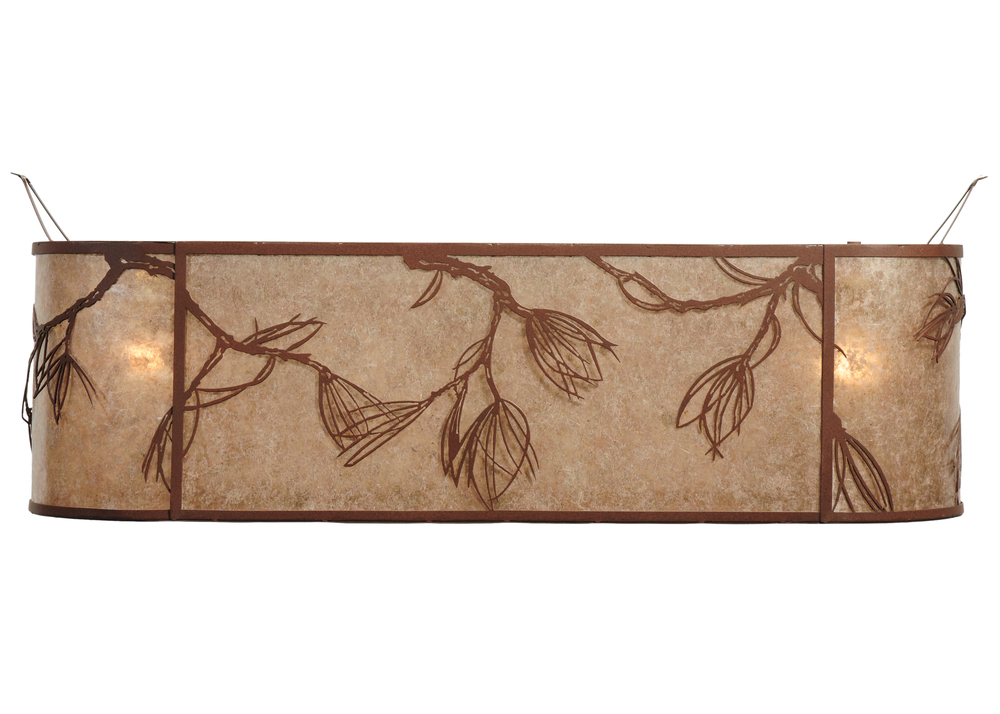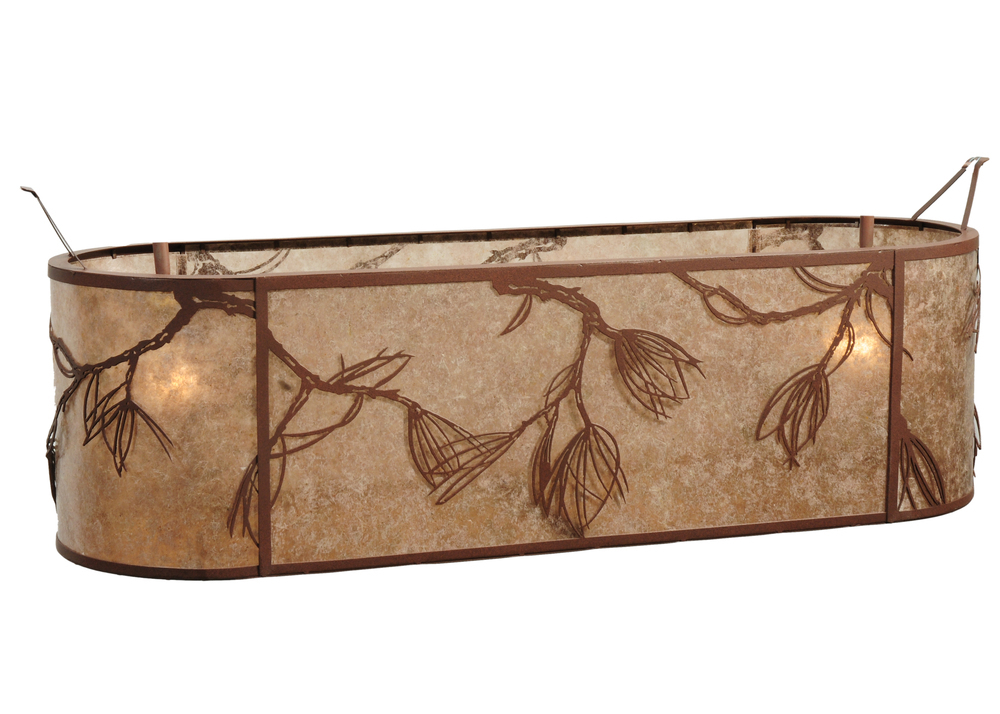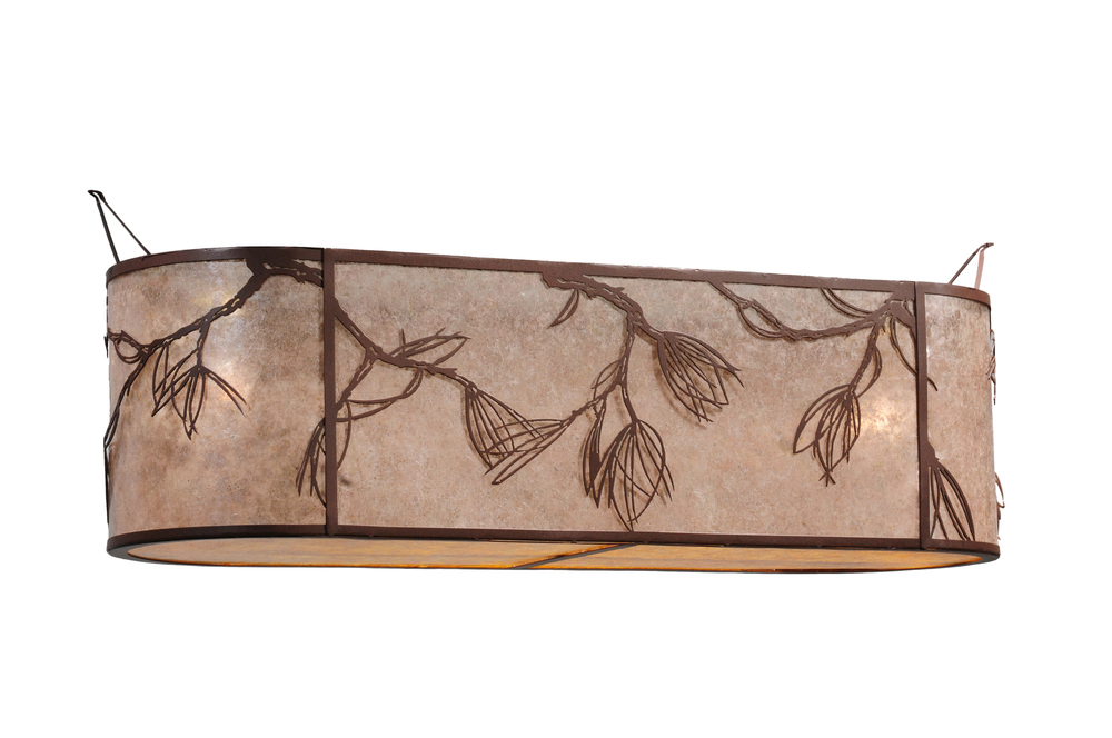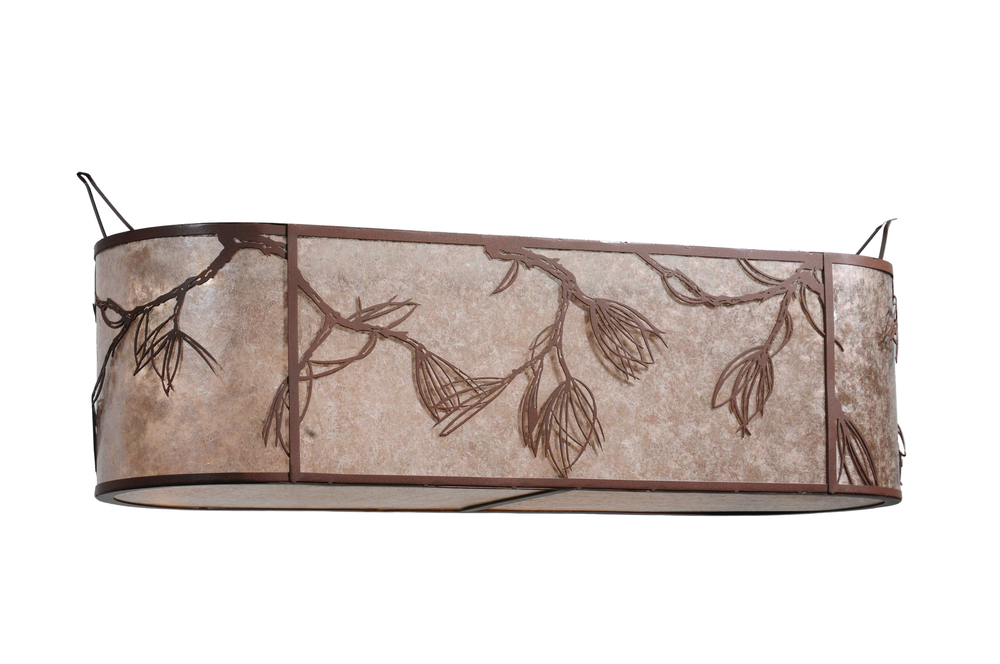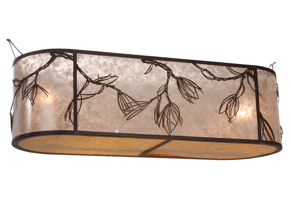 Invite the beauty of nature into your home with our charming Pine shade and Pine needles and branches. Perfect for above kitchen islands or dining tables. Experience the warm beauty of a Silver Mica shade with an Amber Mica diffuser. The shade is finished in Cafe Noir. The hardware; supplied by the customer; was finished in Rust. Handcrafted and assembled in the USA.