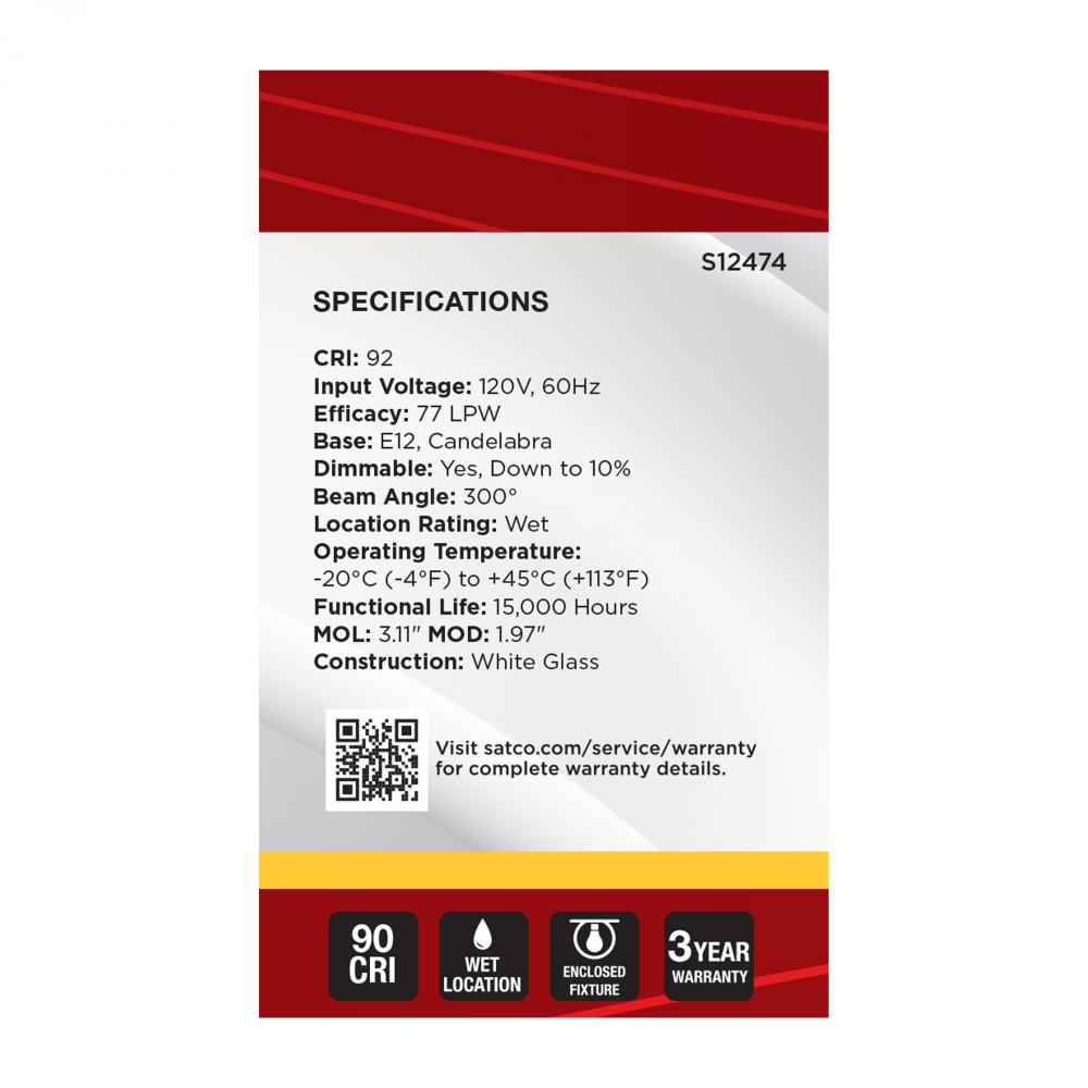 Satco's S12474 4.5-watt LED lamp is traditional, yet contemporary with its sleek finish and energy saving LED technology. Elegantly illuminate any room in the house with this dimmable, globe shaped bulb. Sophisticated and modern, this lamp delivers 15,
