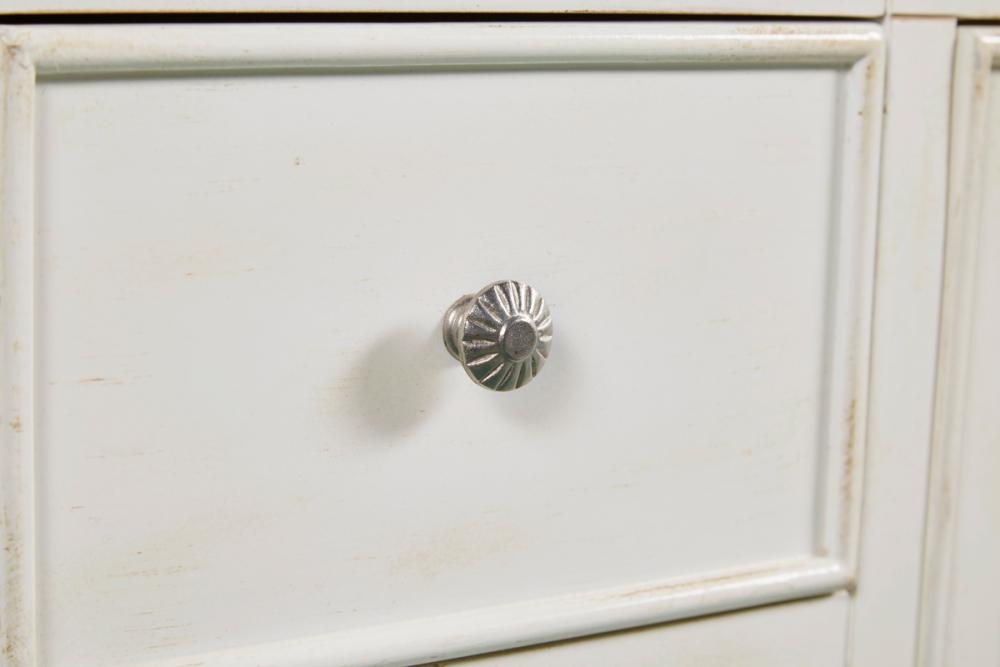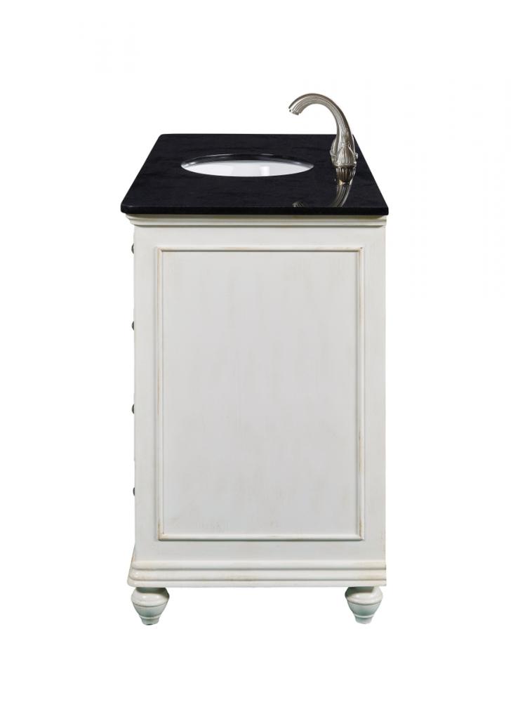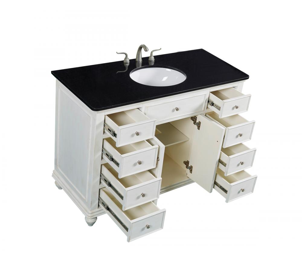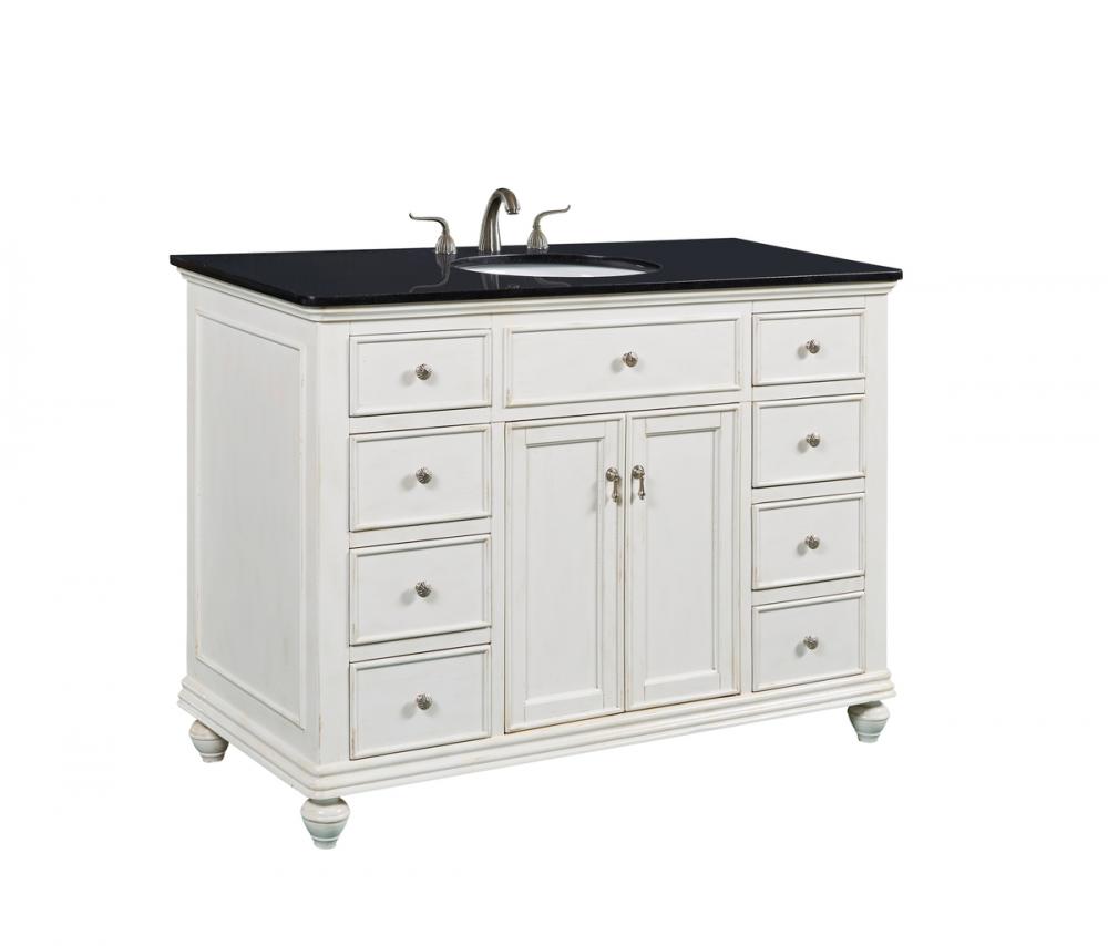 A sleekly styled 4 doors and 8 drawers, granite-topped bathroom vanity like this can only bring a smile of appreciation for its simple beauty and clean lines. With an authentic black granite counter top, oval white porcelain sink, hand painted antique white cabinet, 2 soft-close center doors with a shelf inside, 4 side drawers on each side, brushed steel hardware and carved bun feet, this elegant, transitional vanity balances form and function. Measurements: W48”xD21”xH35”