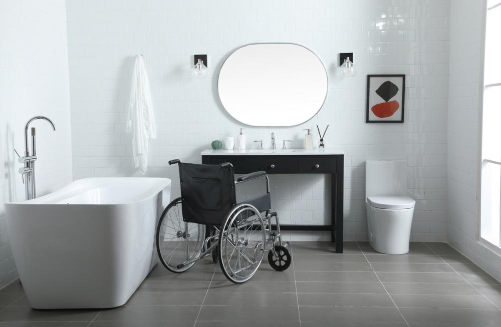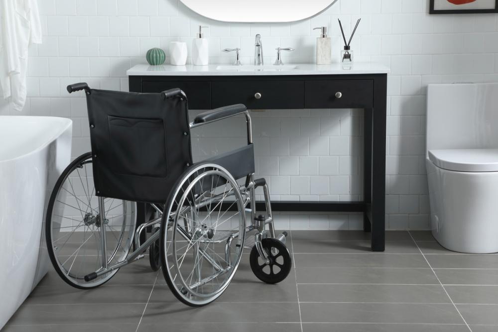 The sink vanity is thoughtfully crafted to accommodate wheelchair access, promoting inclusivity in your bathroom space.