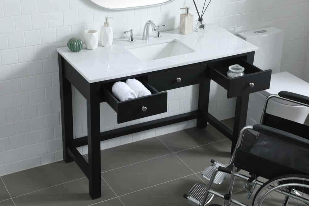 Step into a world of accessibility and sophistication with our Handicap ADA Compliant Bathroom Vanity. Carefully crafted to meet ADA standards, this exceptional piece goes beyond functionality to redefine inclusivity in your bathroom space. The ADA compliant sink cabinet opens doors to unparalleled wheelchair access, ensuring that everyone can navigate their daily routines with ease. The undermount porcelain sink, coupled with a durable Calacatta look engineered marble stone top, adds a touch of timeless luxury to your bathroom while standing up to the demands of everyday use. Versatility meets personalization with predrilled countertops featuring three holes, ready to accommodate a variety of faucets (faucets not included). The thoughtful design extends to the soft closing glides on the drawers, creating a serene and noise-free environment in your bathroom sanctuary.Say goodbye to the complexities of assembly – our vanity ships fully assembled and ready to use, offering you convenience from the moment it arrives. The generous 27-inch knee clearance from the floor ensures optimal comfort and accessibility, catering to the unique needs of individuals using wheelchairs. Every detail has been considered, including a discreetly placed overflow hole in the porcelain sink. This thoughtful touch not only enhances the aesthetic appeal but also adds a practical element, ensuring a seamless and worry-free experience.Elevate your bathroom to new heights with our Handicap ADA Compliant Bathroom Vanity, where accessibility meets elegance, and every feature is designed to enhance your daily rituals. Redefine your space with a commitment to inclusivity without compromising on style.