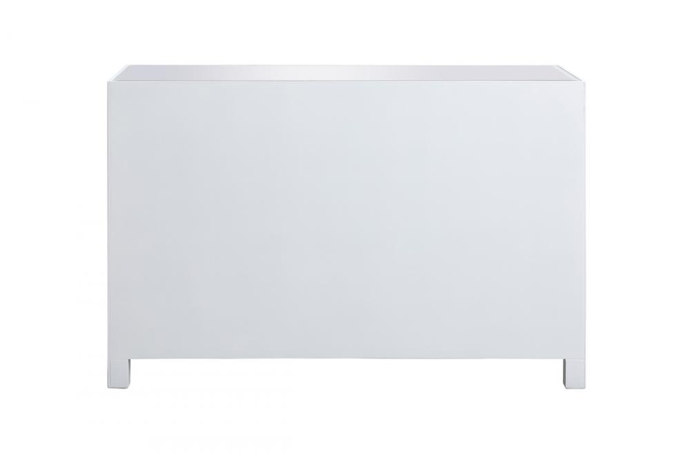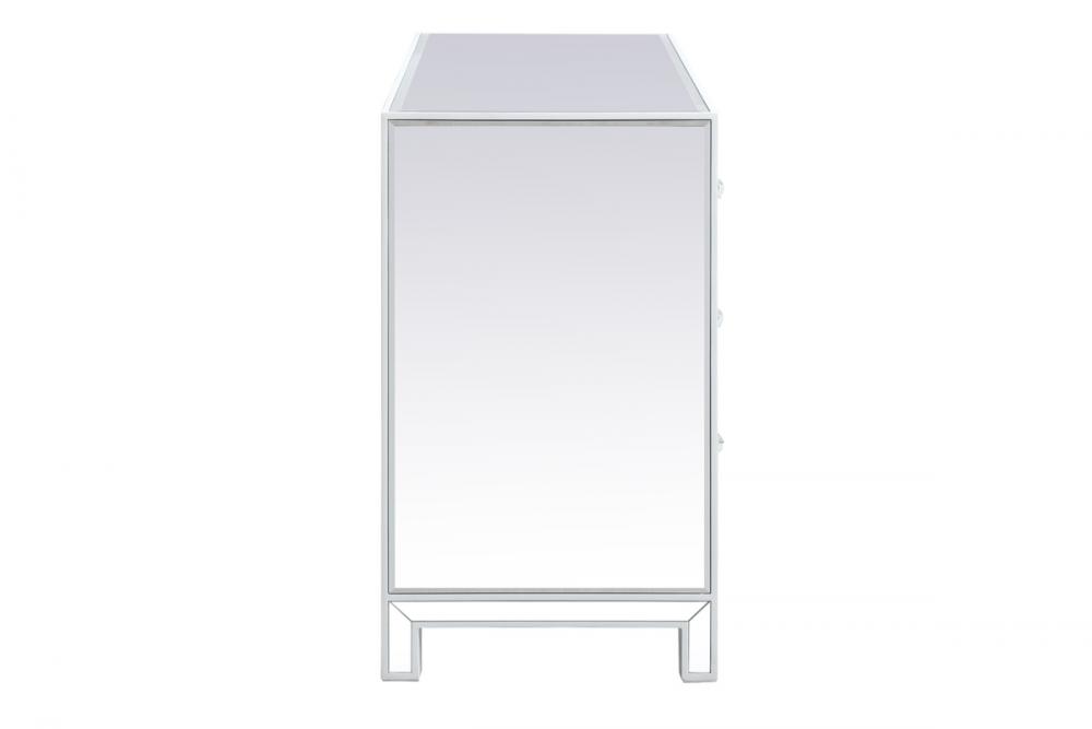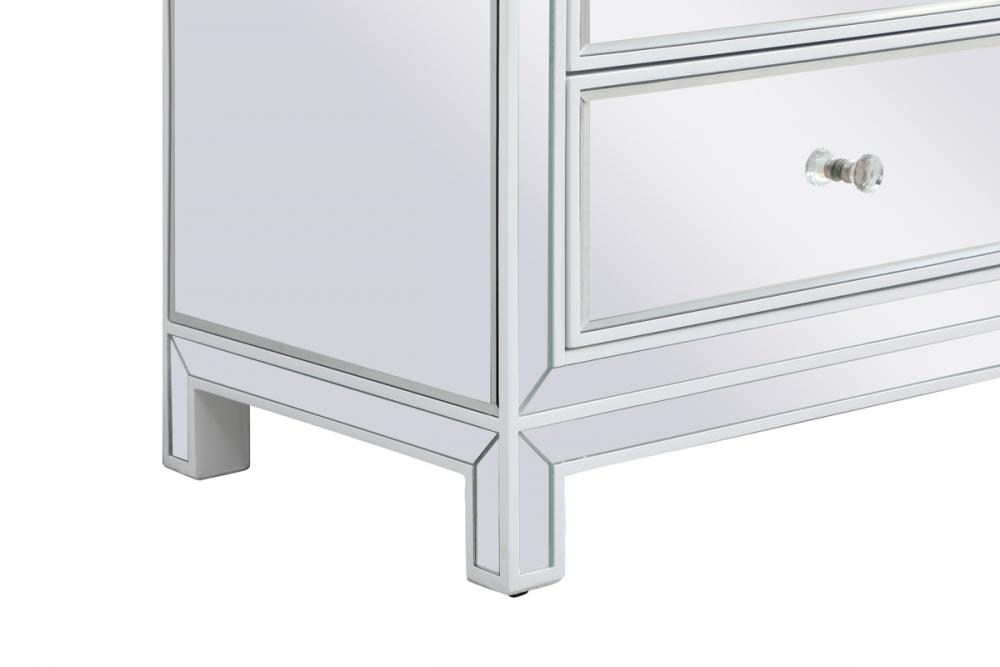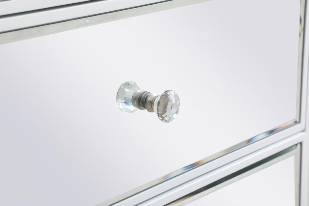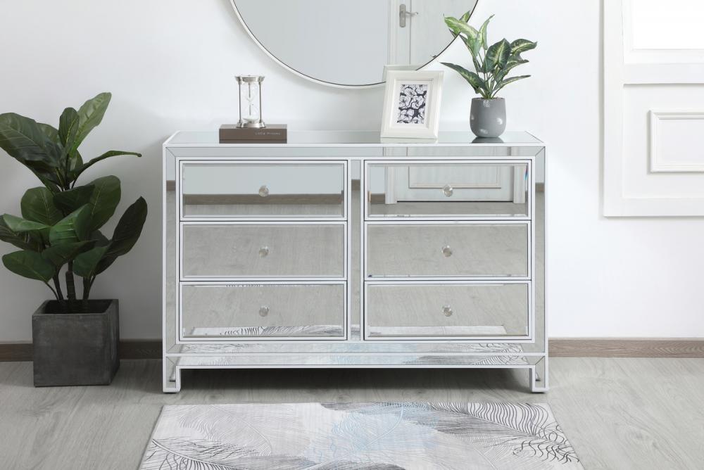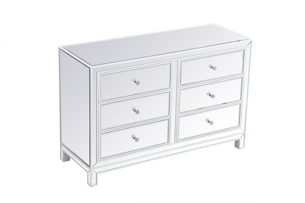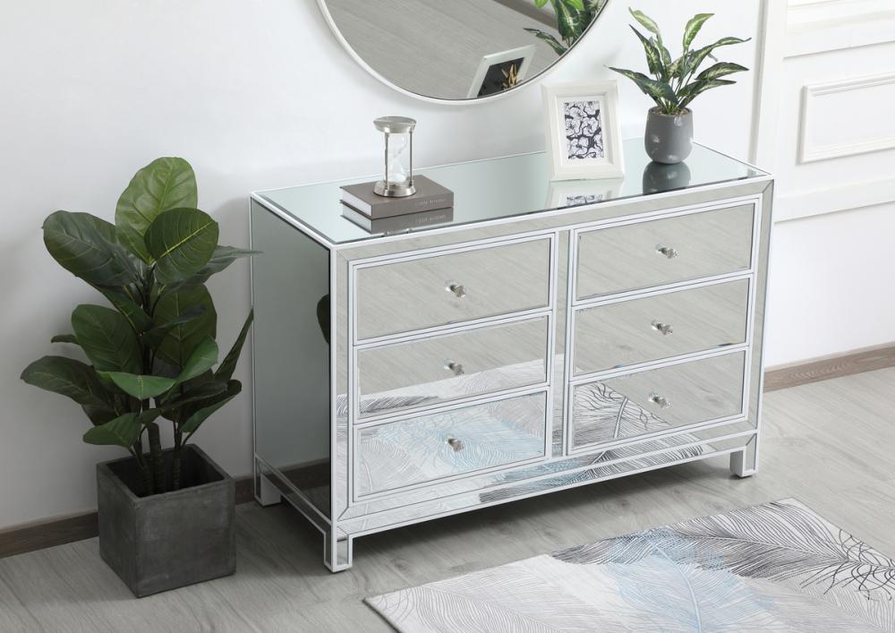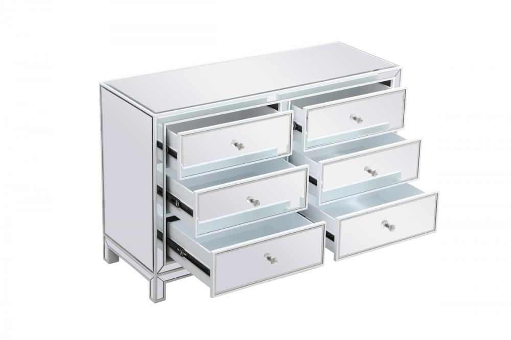 Sophisticated with a reflective touch, this 48 inch wide mirrored cabinet adds style and functionality to any room. Six deep drawers provide ample storage space, each decorated with a crystal knob. Distinctively designed with mitered corners, all surfaces are inlaid with mirror panels.