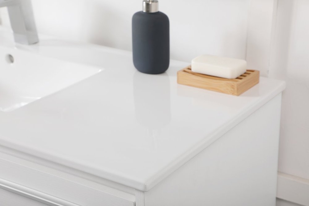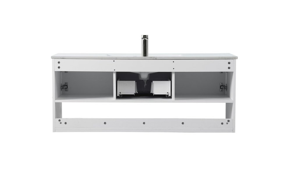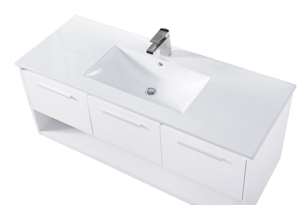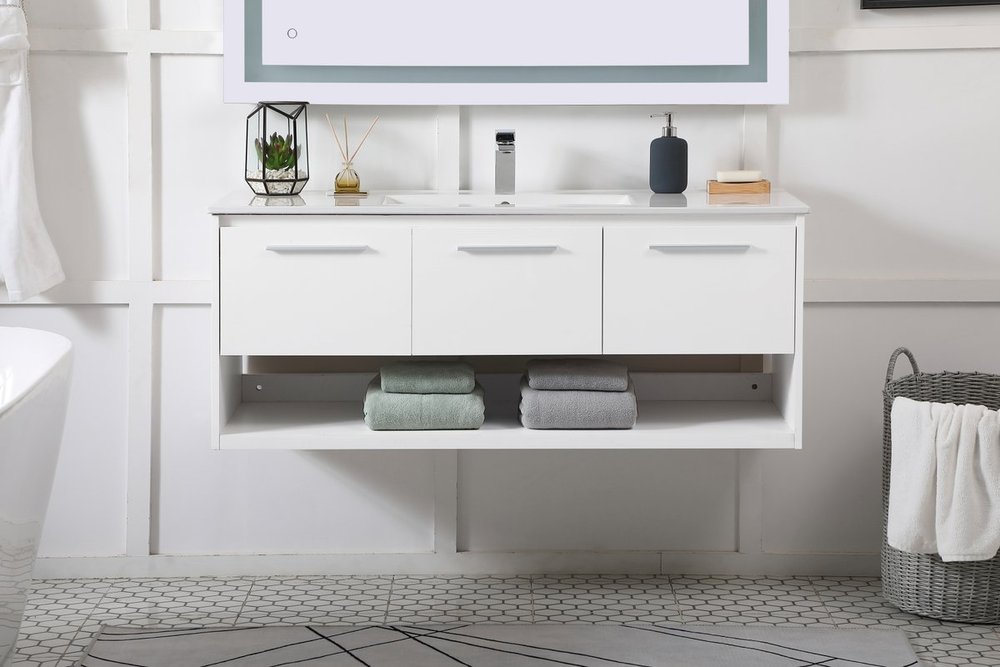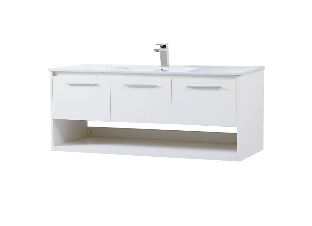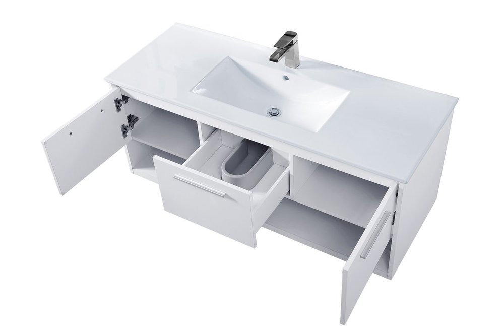 Save space and make your bathroom appear bigger with this 48" floating vanity in a white finish. Its minimal design will have you in awe, while its clean lines will leave your room feeling fresh and uncluttered. The Single u-drawer and 2 cabinet doors pulls out for storage while the open space below allows you to place extra towels or various other essentials.