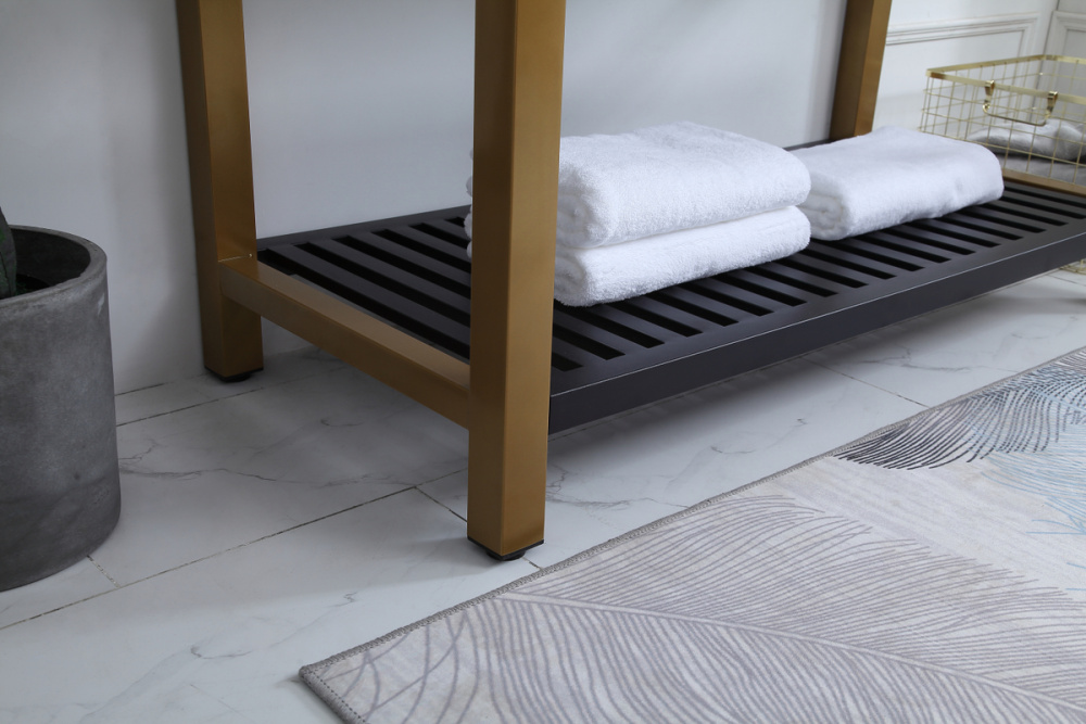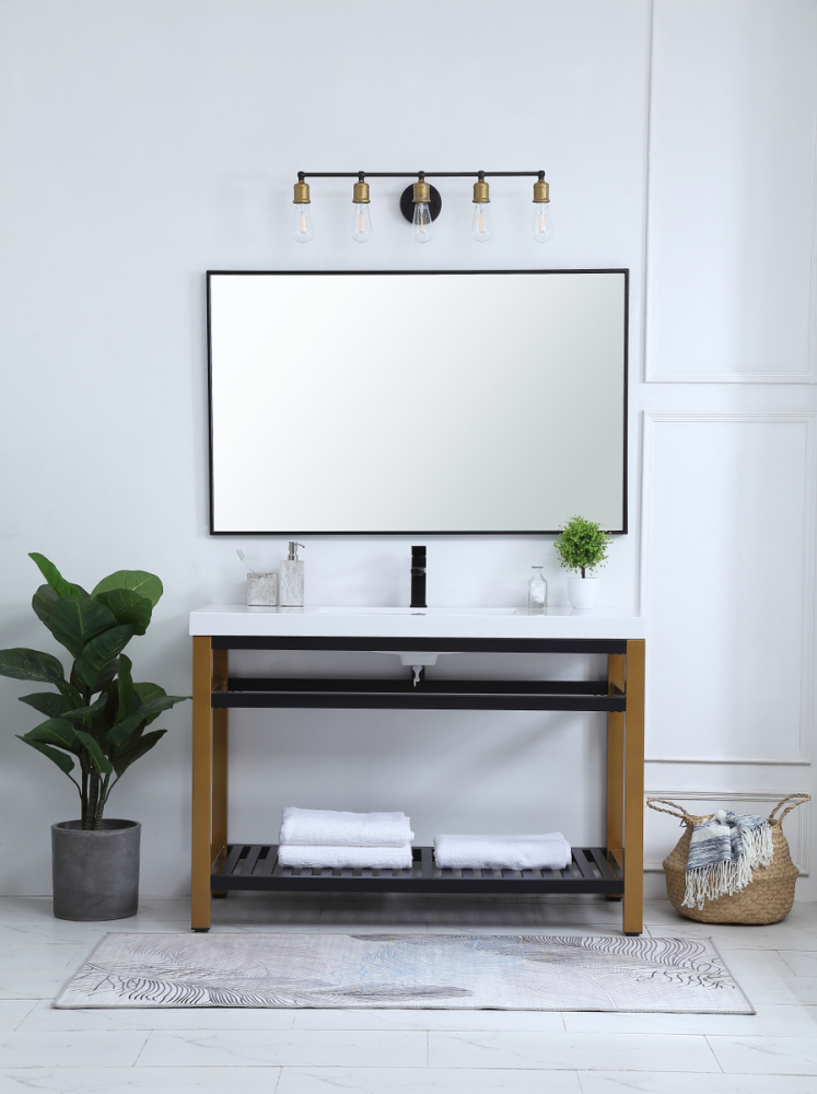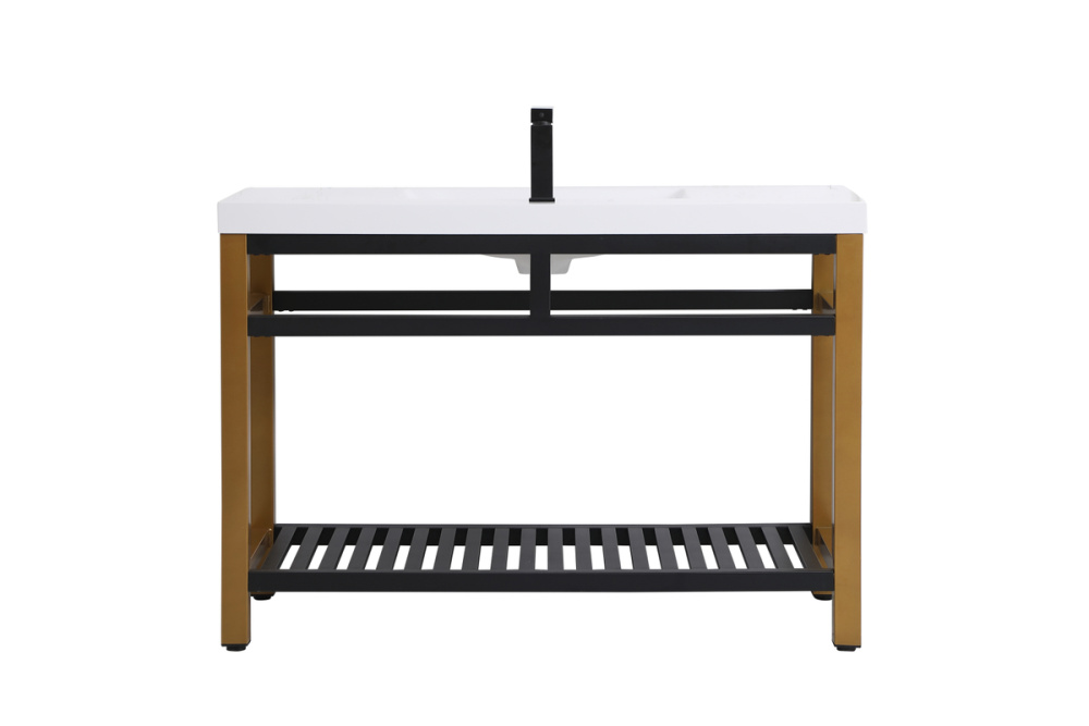 In true minimalistic spirit, this 48" vanity shines with pared down elegance. Bold clean lines build up the metal vanity, creating a modern simplicity that adds visual liveliness and complements any bathroom or powder room. The bottom shelf lets you put away any extra towels or bathroom essentials, and its shining white undermount sink creates contrast against the finish. Its bold graphic style will create a contemporary style in your home.