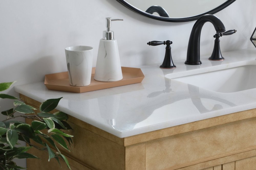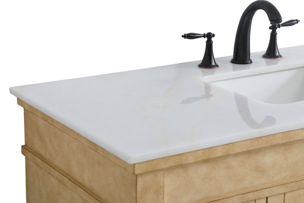 Distressed antique beige finish with a luxurious white with occasional coffee color vein marble countertop