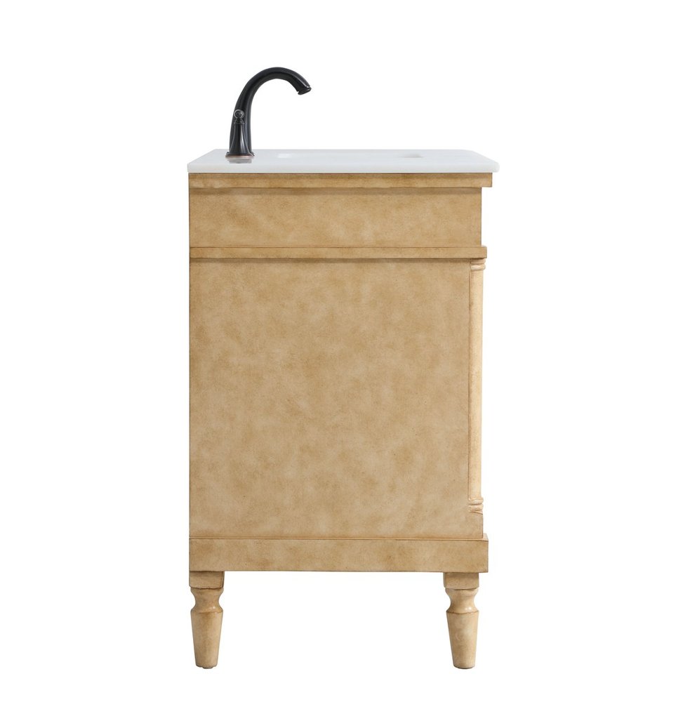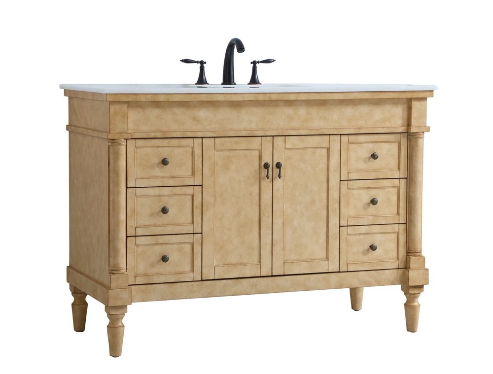 The subtle beauty of the Lexington collection 48" vanity in an antique beige finish exudes comfortable luxury. Its modern, yet traditional beauty will surely dress up your bathroom or powder room without any fuss. The white marble countertop with occasional coffee color veins and porcelain undermount sink shows quiet opulence, and the legs support upright without fail. Antique bronze hardware complements the refined beige finish, with pulls adorning the two center cabinet doors and ornate knobs dressing the six side drawers, showcasing ample storage space within. Whether this vanity is in your bathroom or for guests, its presence will surely elevate the aesthetics of your room.