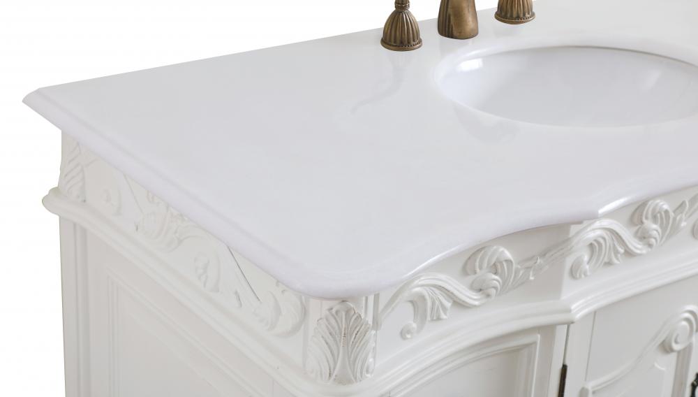 This superb balance of timeless tradition and opulent beauty in a traditional vanity will certainly enhance the aesthetics of any home or office bathroom! Featuring an ivory white engineered marble countertop complimenting the hand painted cabinet. With two doors and six drawers, as well as antique bronze finish door knobs, this superbly carved floral design, stands on stylishly carved solid wood French scroll feet. The vanity ships fully assembled with a convenient open access plumbing panel.