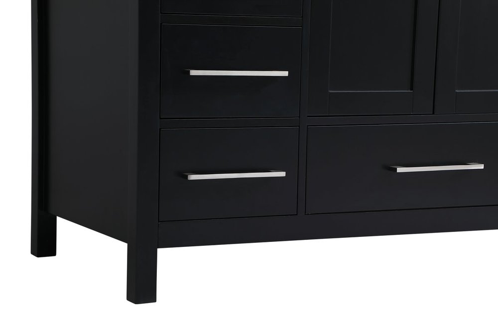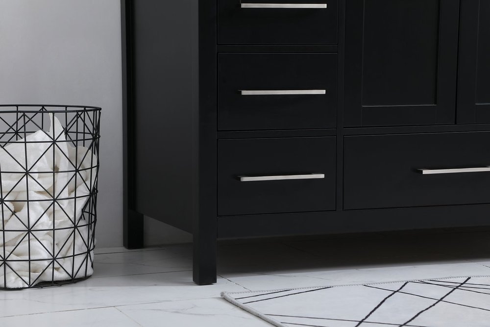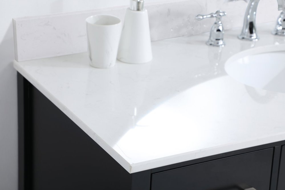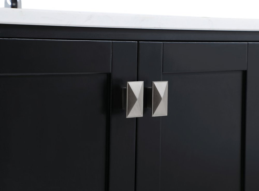 Never compromise beauty--the Irene collection stunning vanity in a black finish will add lovely sophistication and complement any bathroom or powder room, while utilizing its charm and function to provide you with ample storage spaces. Brushed nickel pulls gently adorn the minimalist cabinet doors and drawers at the base, allowing for you to store away your bathroom essentials. The calacatta engineered marble countertop, porcelain undermount sink, dignified subtle engravings on the side edges, and squared legs all come together to create contemporary beauty. Work with your space, and design a beautiful room, no matter the size. Comes with a matching backsplash to complete the look and protects your wall.