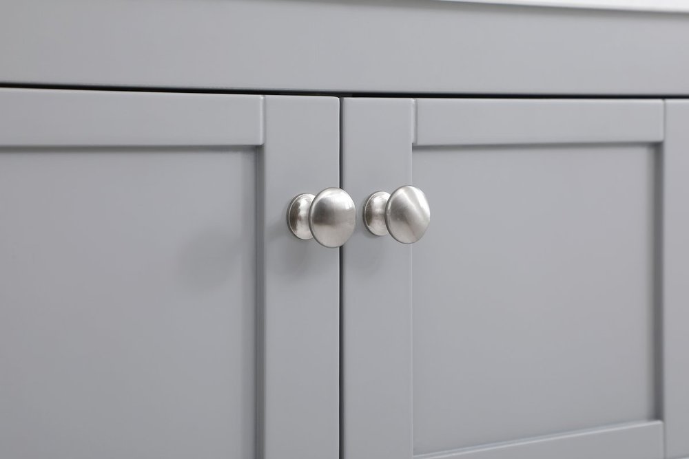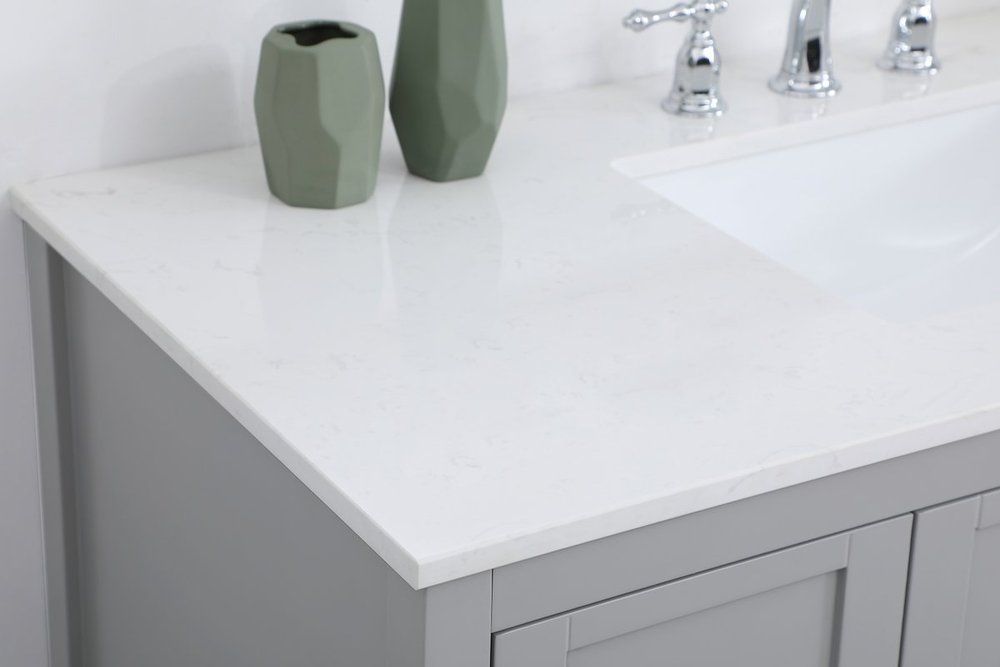 The subtle beauty of the Theo collection 48" vanity in a gray finish exudes comfortable luxury. Its modern, yet traditional beauty will surely dress up your bathroom or powder room without any fuss. The white stone countertop and porcelain undermount sink shows quiet opulence, and the legs support upright without fail. Brushed Nickel hardware complements the trendy gray finish, with pulls adorning the two cabinet doors and four drawers, showcasing ample storage space within. Slated shelf allows for additional space to organize your towels. Whether this vanity is in your bathroom or for guests, its presence will surely elevate the aesthetics of your room.
