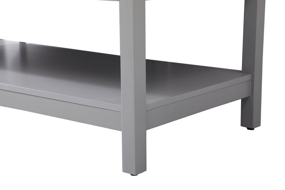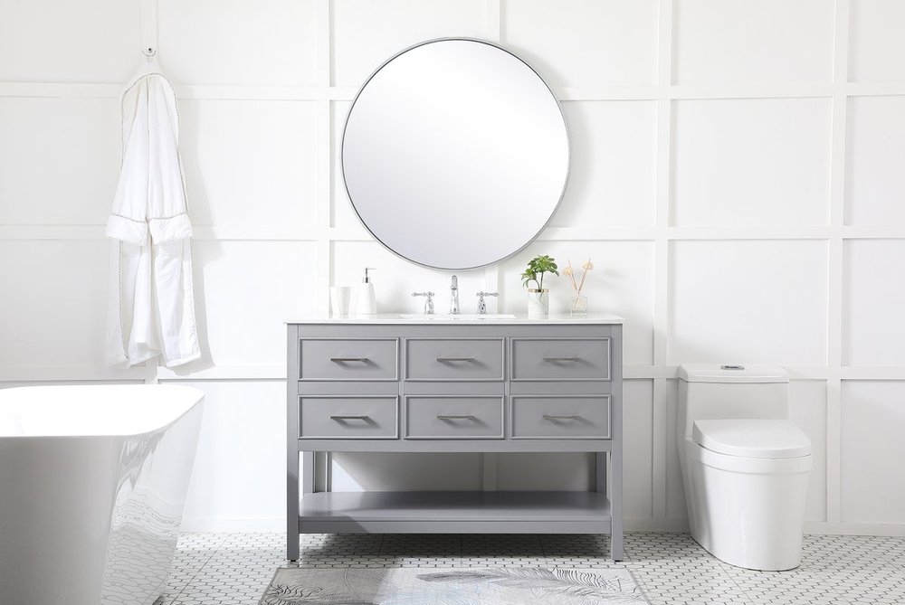 Make the most of your space with this traditional style bathroom vanity. Complements well with many aesthetics with its beautiful finish, calacatta engineered marble countertop, and the contemporary slender handle bar that sits on one false drawer and five functional drawers with soft closing mechanism, allowing you to store an assortment of bathroom essentials. The lower shelf makes it the perfect space to hold new towels for your guests. This compact vanity ensures both form and function in your bathroom or powder room for you and your guests.