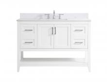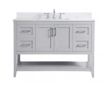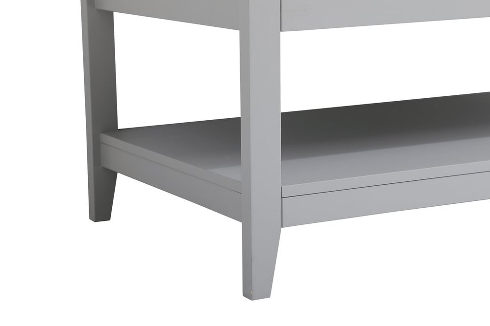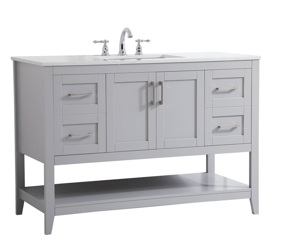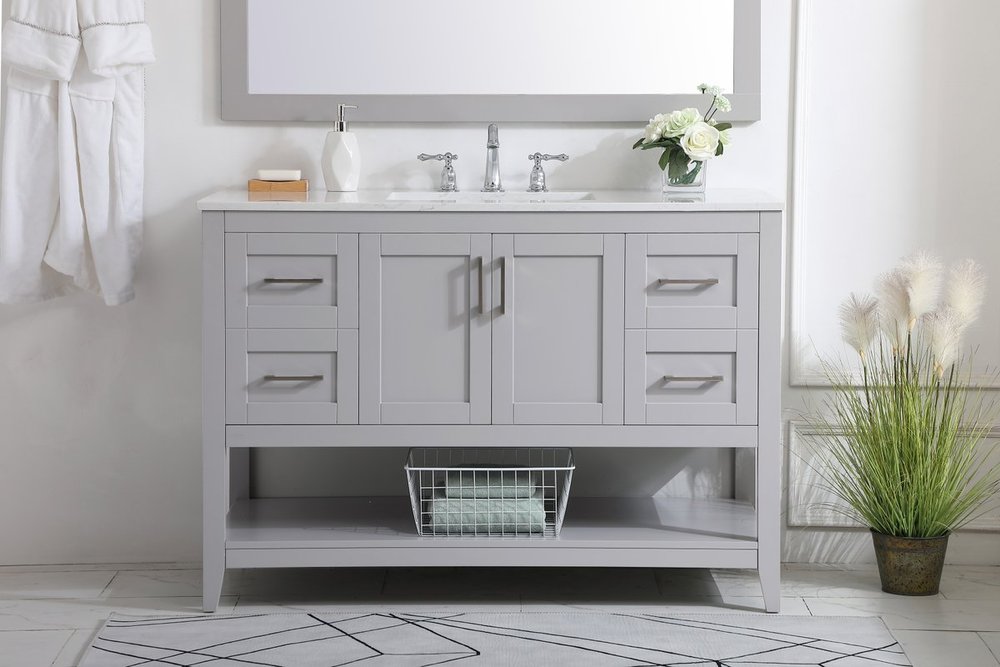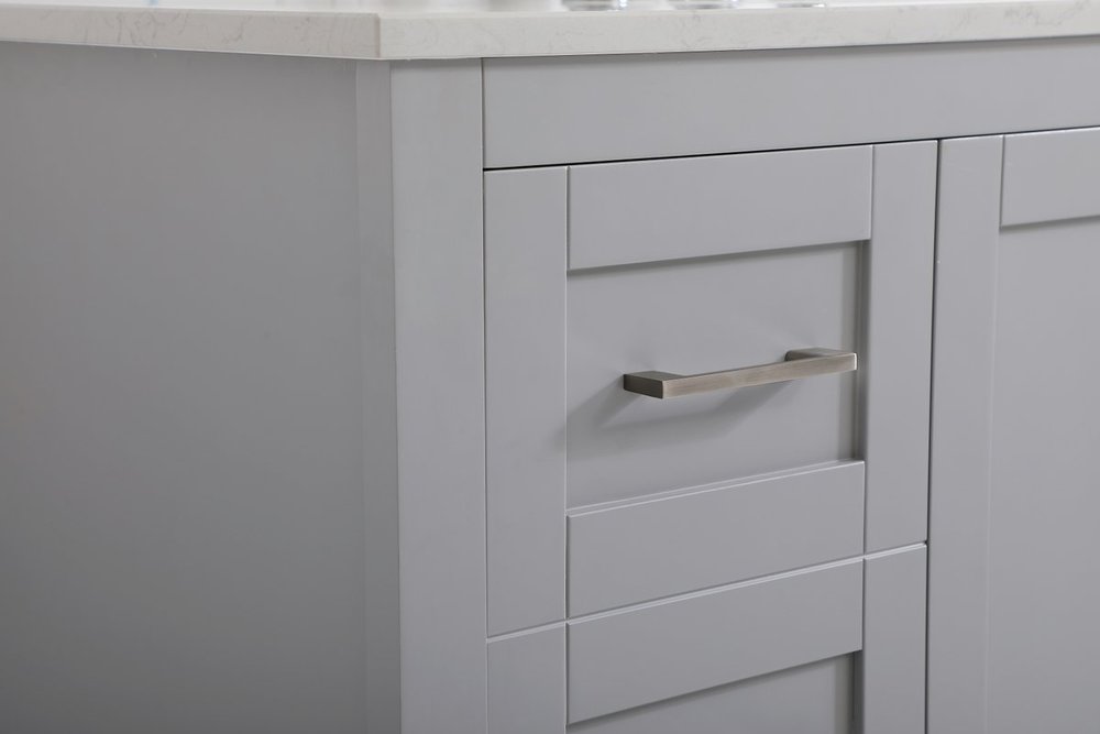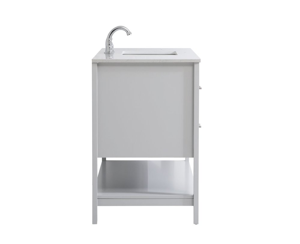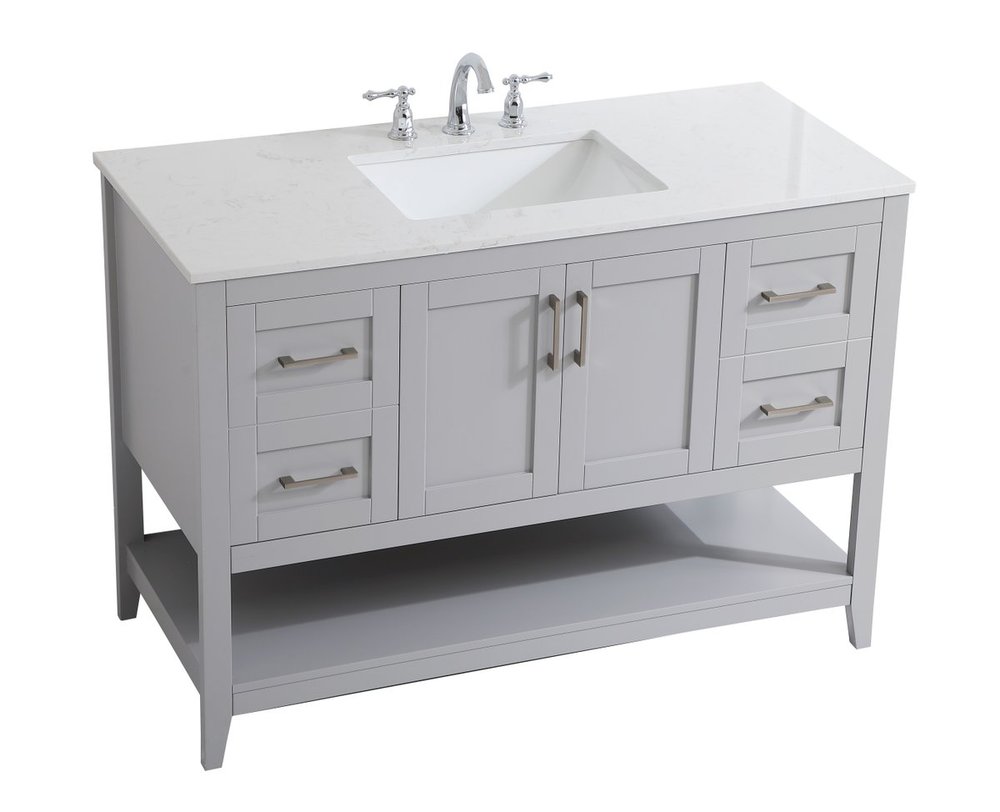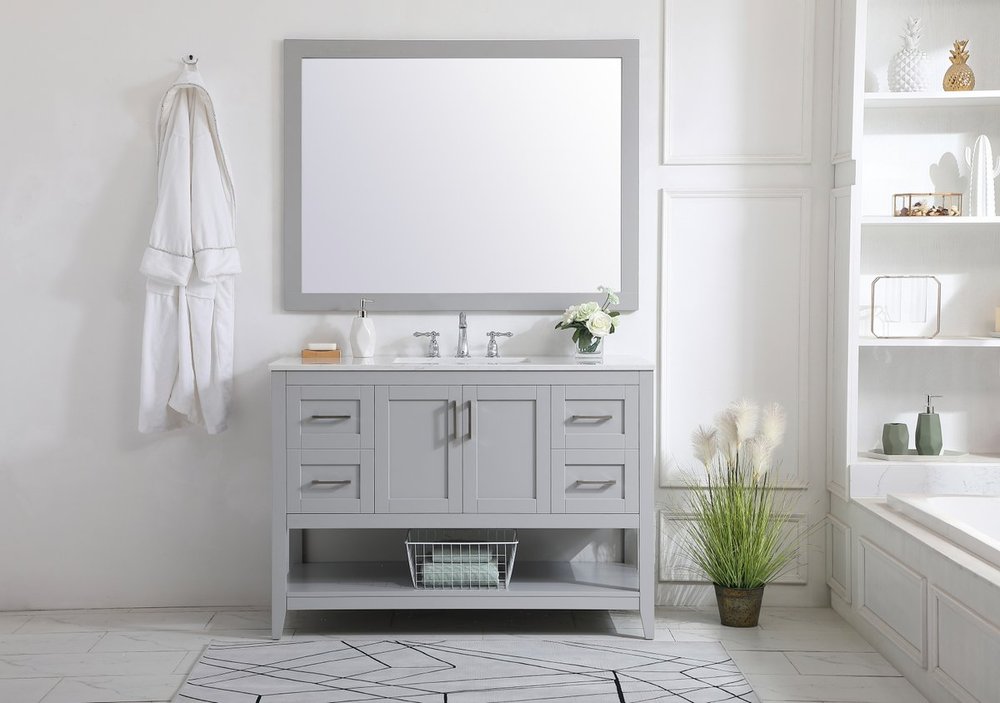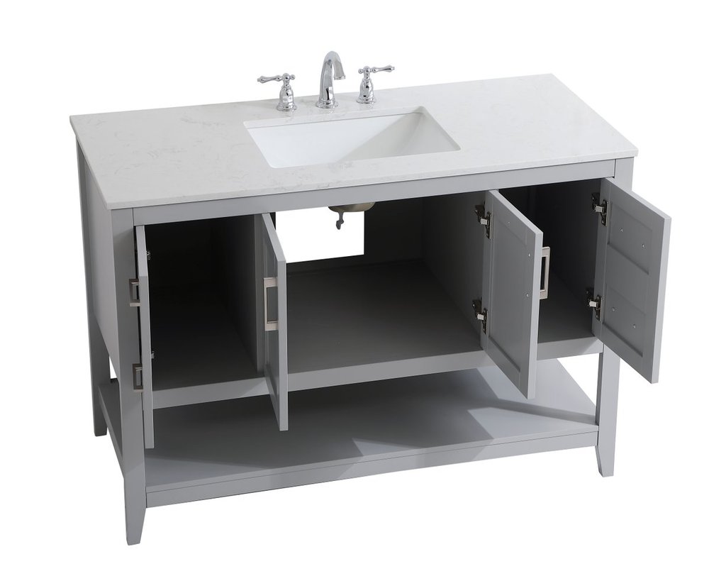 The nonchalant attitude of this 42" traditional grey finish vanity will have you wanting more. The slender brushed nickel handle bars open the center double cabinet and two side cabinet doors to reveal ample storage space to put away and store bathroom essentials, and the open space below allows for you to place clean towels on the rack. Topped with a Calacatta engineered marble countertop, you and your guests will enjoy this easy going vanity.