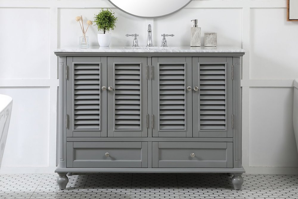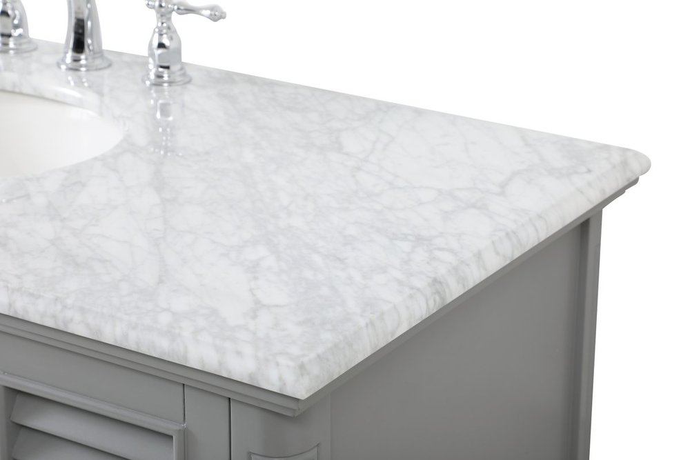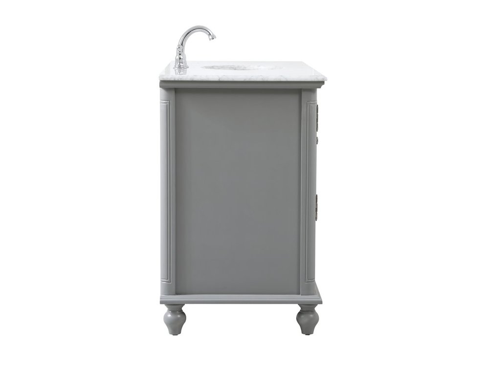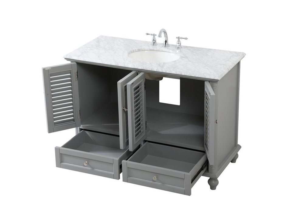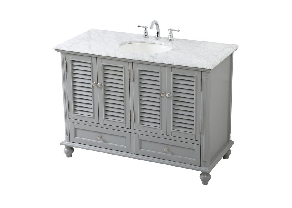 The Rhodes collection compact vanity will add lovely sophistication and complement any small bathroom or powder room, while utilizing its charm and function to provide you with ample storage spaces. Metal round knobs gently adorn the shuttered cabinet door and drawer at the base, allowing for you to store away your bathroom essentials. The Carrara white marble countertop, porcelain undermount sink, dignified subtle engravings on the side edges, and rounded legs all come together to create contemporary beauty. Work with your space, and design a beautiful room, no matter the size.