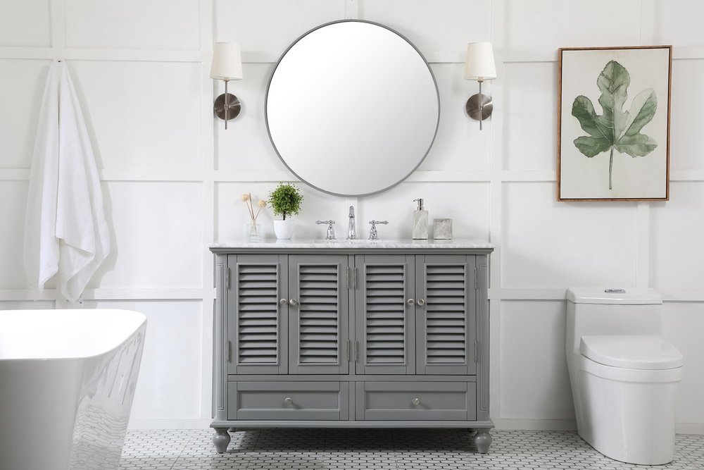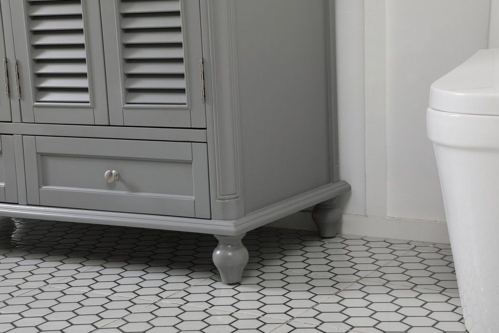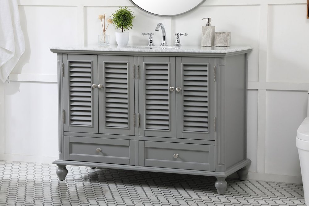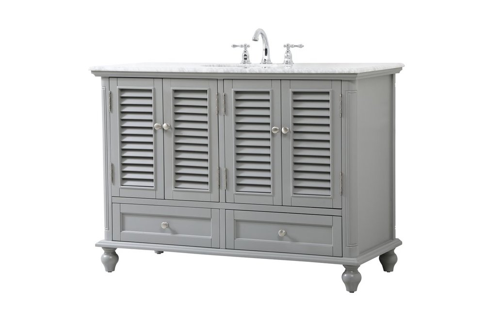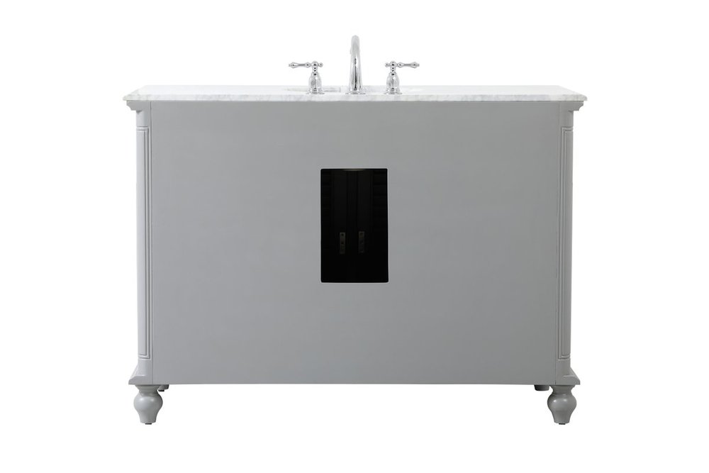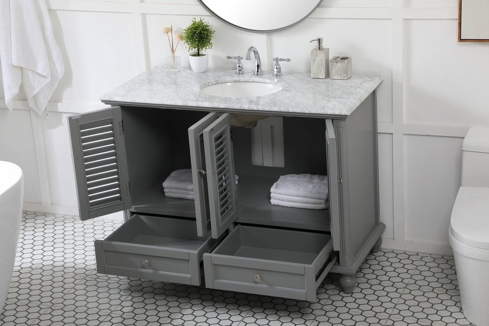 The Rhodes collection compact vanity will add lovely sophistication and complement any small bathroom or powder room, while utilizing its charm and function to provide you with ample storage spaces. Metal round knobs gently adorn the shuttered cabinet door and drawer at the base, allowing for you to store away your bathroom essentials. The Carrara white marble countertop, porcelain undermount sink, dignified subtle engravings on the side edges, and rounded legs all come together to create contemporary beauty. Work with your space, and design a beautiful room, no matter the size.