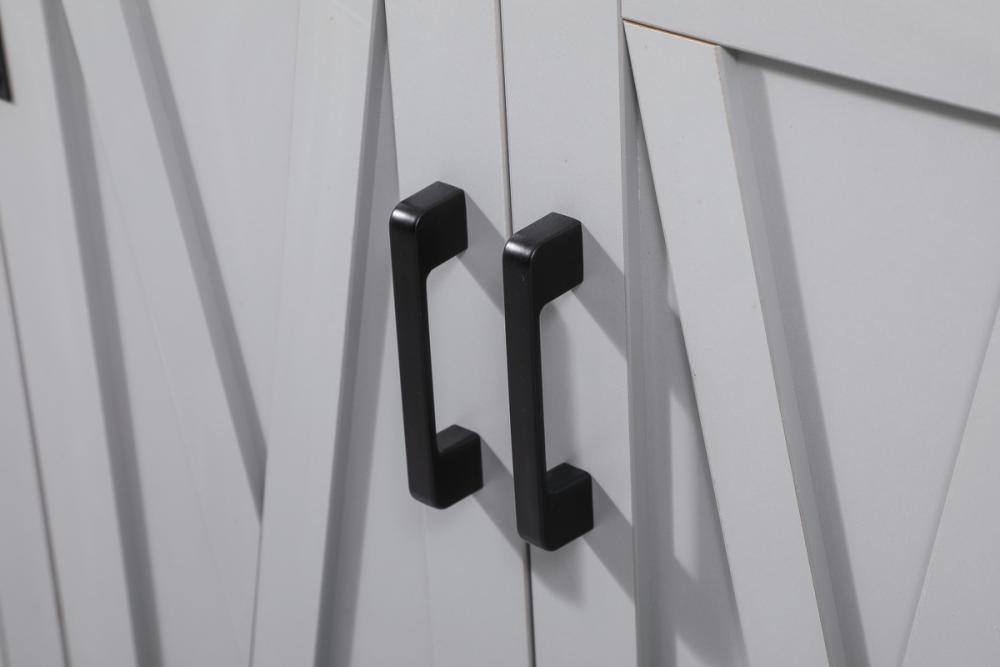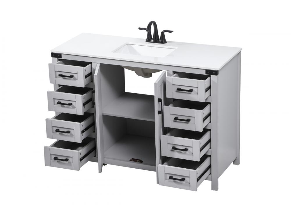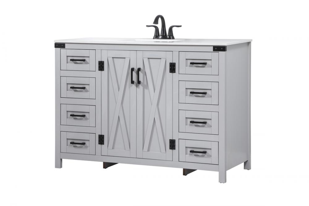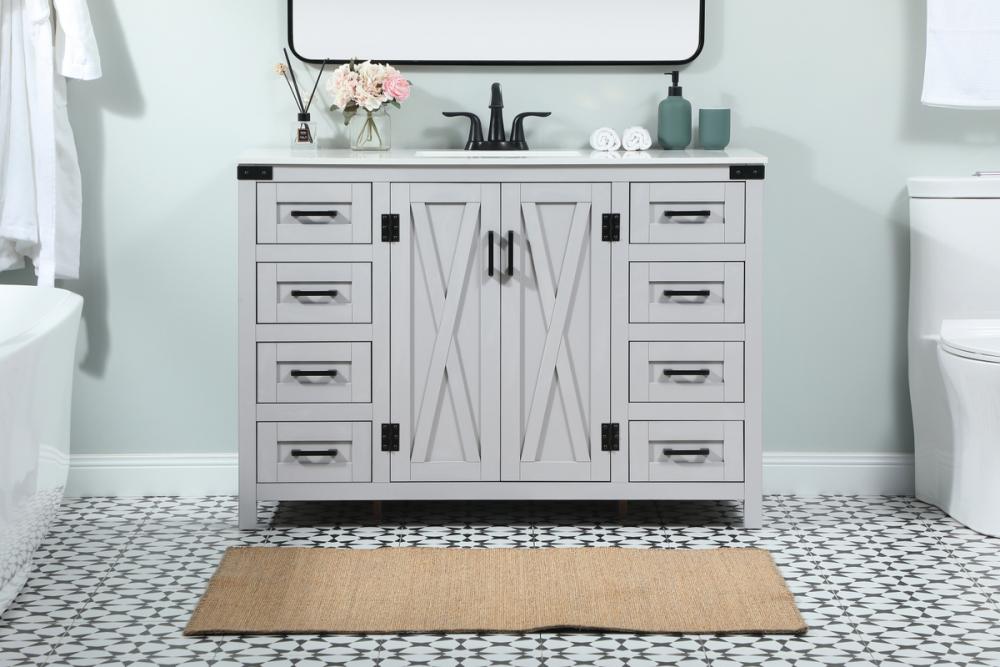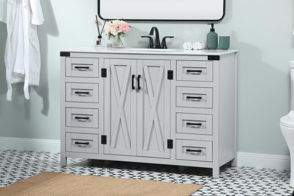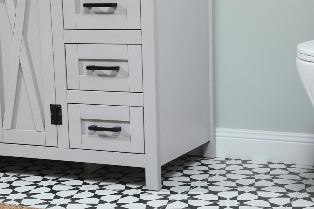 Reminiscent of barn doors, the two door cabinet and eight drawers adds both stylistic charm and function with its plethora of storage options for all your bathroom essentials. Whether for your bathroom or the guests', everyone will marvel at its classic look for traditional and farmhouse aesthetics. A slab of engineered marble rounds out the piece up top, as well as the porcelain under mount sink and predrilled faucet holes. This vanity arrives fully assembled.