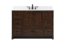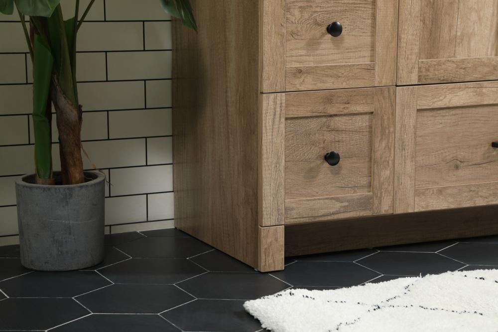 Delve into a world of minimalistic fashion and contemporary styling with this farmhouse 48" vanity. The clean faux lines anchors the weathered design. Black handle adorns the two doors hiding the base of the integrated porcelain sink while the bottom drawer and side drawers allow you to store your bathroom necessities and toiletries. It is the perfect vanity for any bathroom, regardless of size.