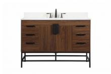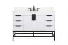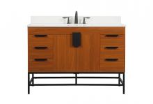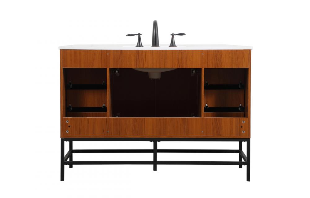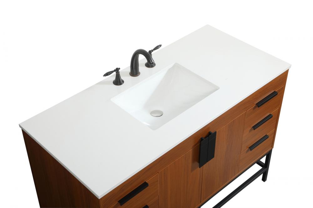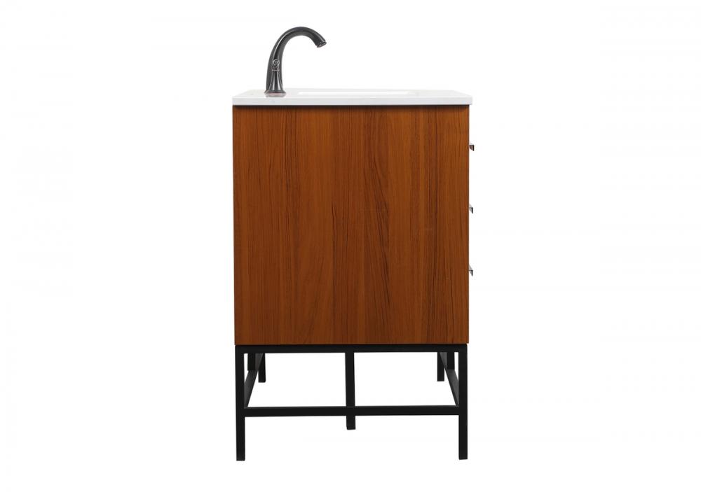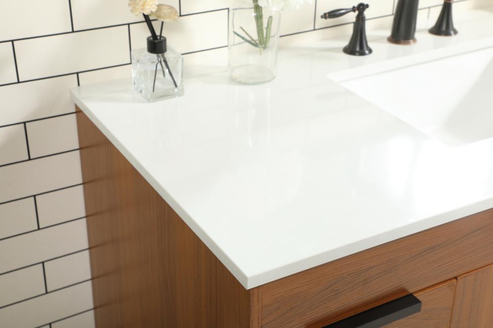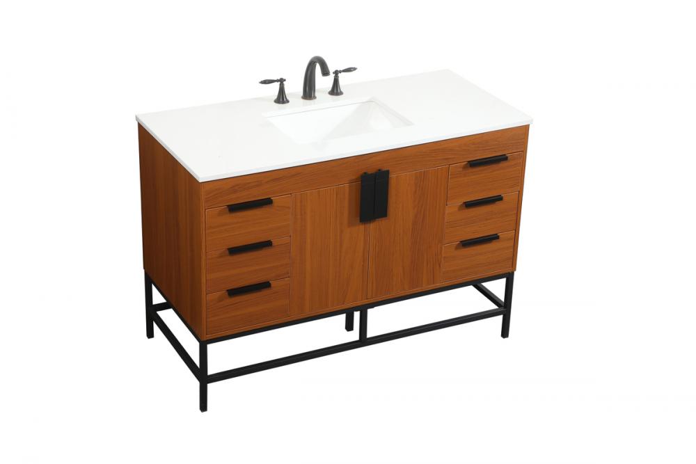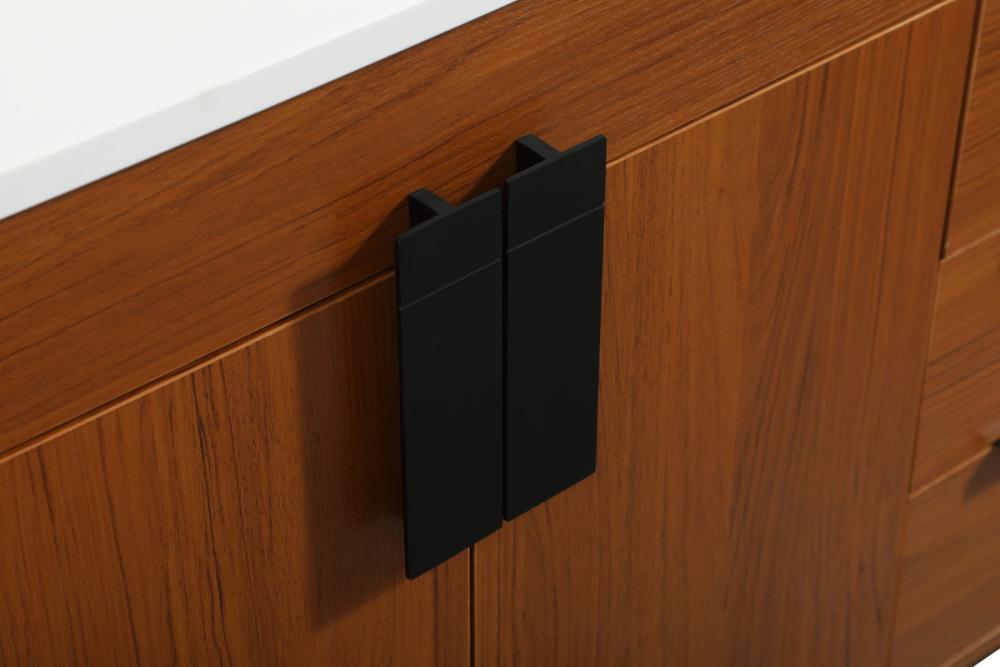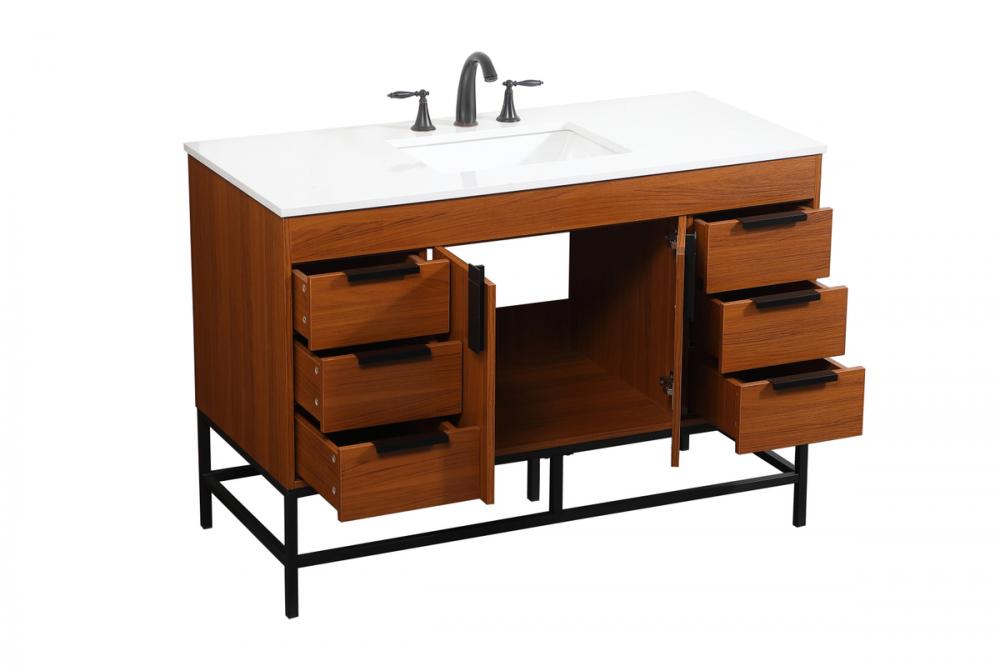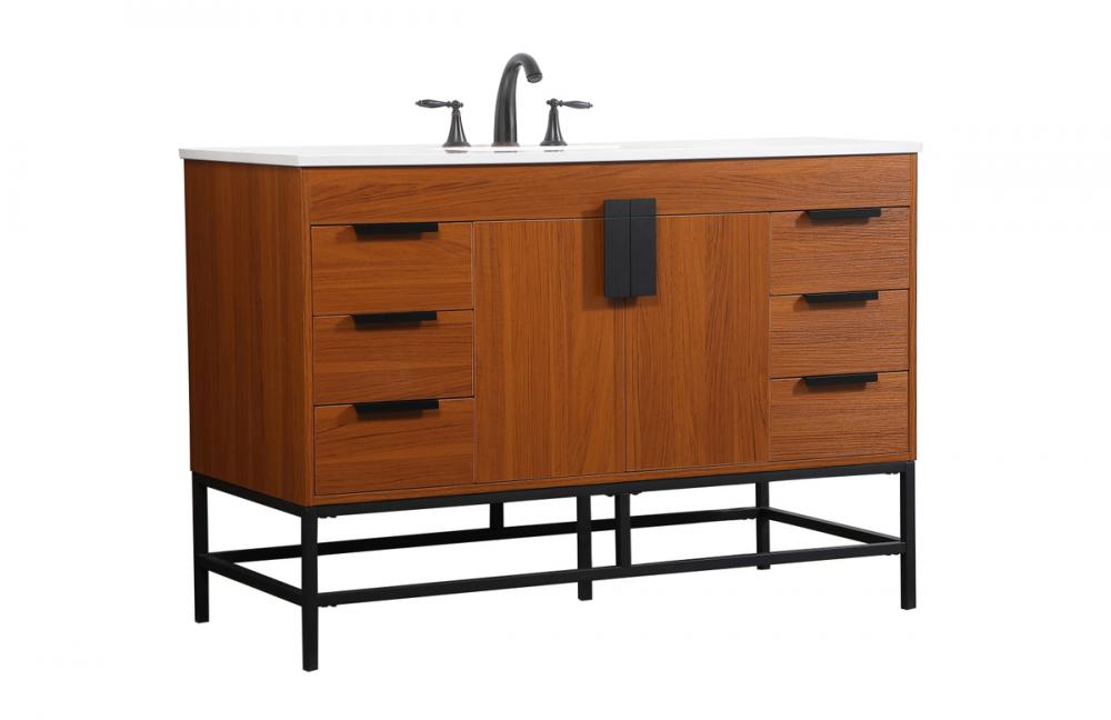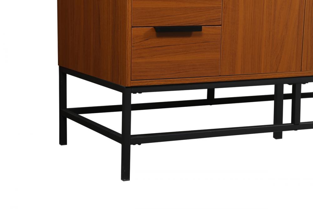 This vanity is a sleek-looking piece of bathroom furniture that is easy to incorporate into your design scheme. The cabinet features a smooth door panel with an oversized steel handle and soft close hinges provide ample room for accessories. Packed with multiple side drawers with soft close glides for added comfort and full access to bath supplies. Constructed of engineered wood, the powder-coated metal rod legs are an urban industrial look that we love. Minor assembly of the metal legs needed to get this vanity up and running. Comes with a matching backsplash to complete the look and protects your wall.