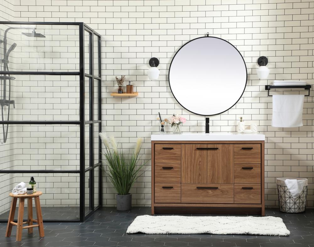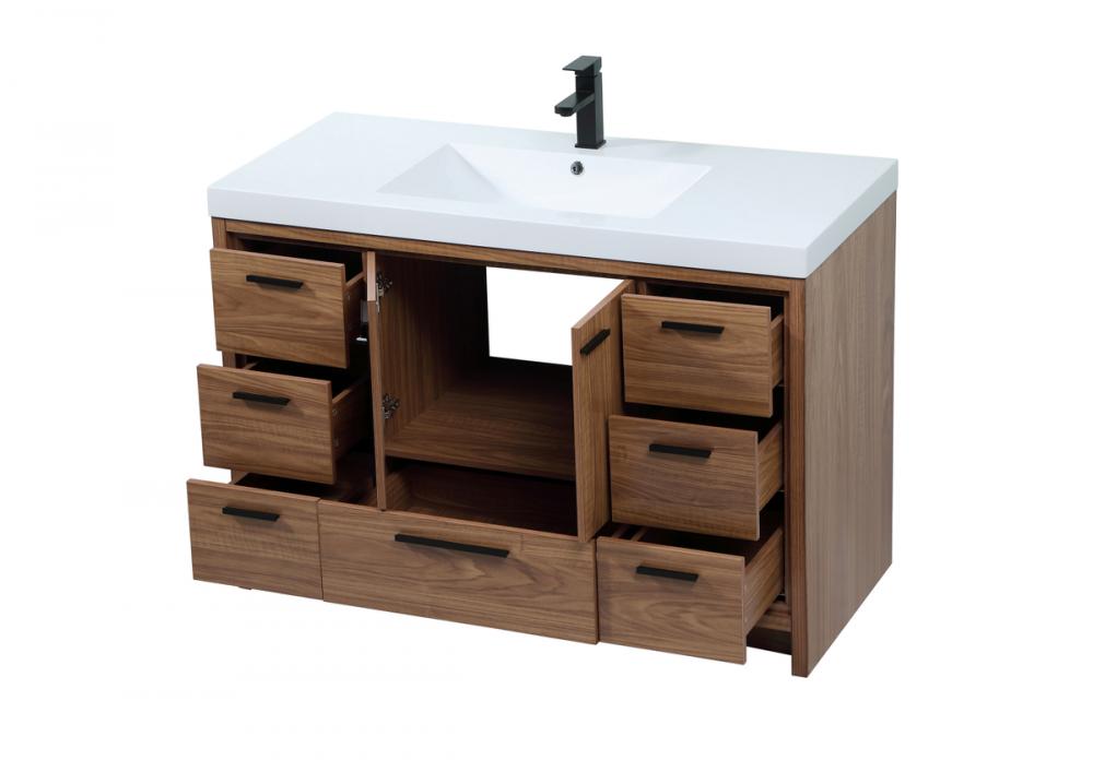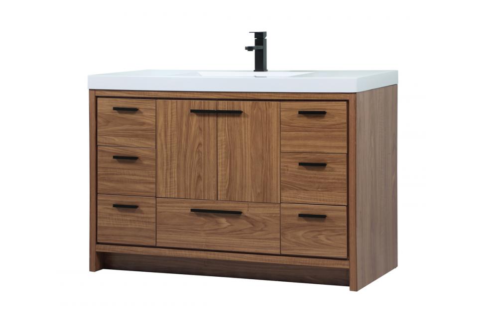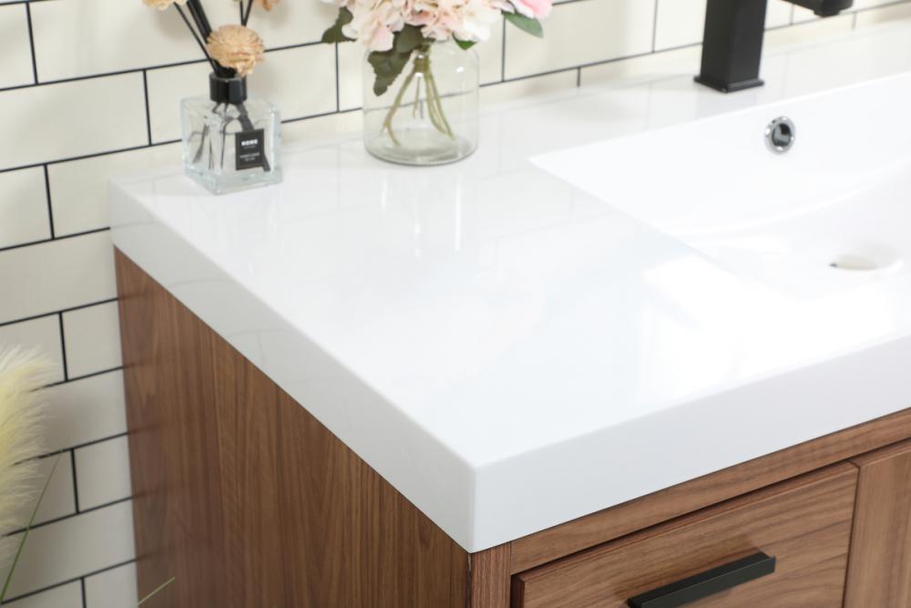 Modern sophistication is defined within the wood finish look and black barpulls of this vanity. Its length makes it the perfect addition to any sized home, and saves space with its storage area hidden behind the double cabinet doors and one bottom drawers. Topped with a highly durable thick resin white counter top and an integrated sink, this modern design will add everlasting class to your bathroom and powder room.