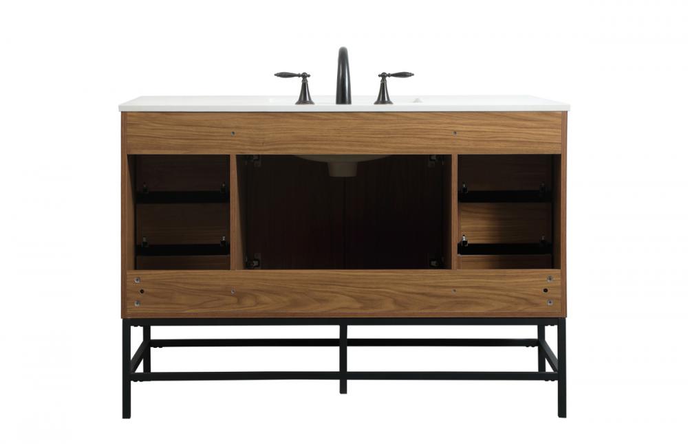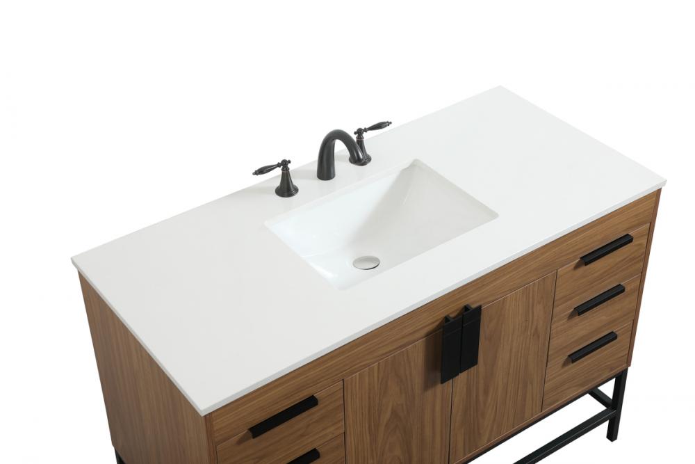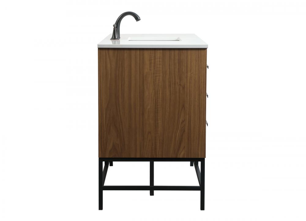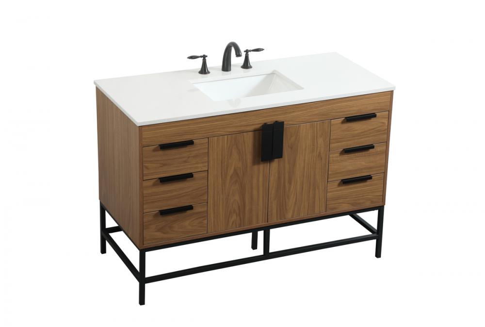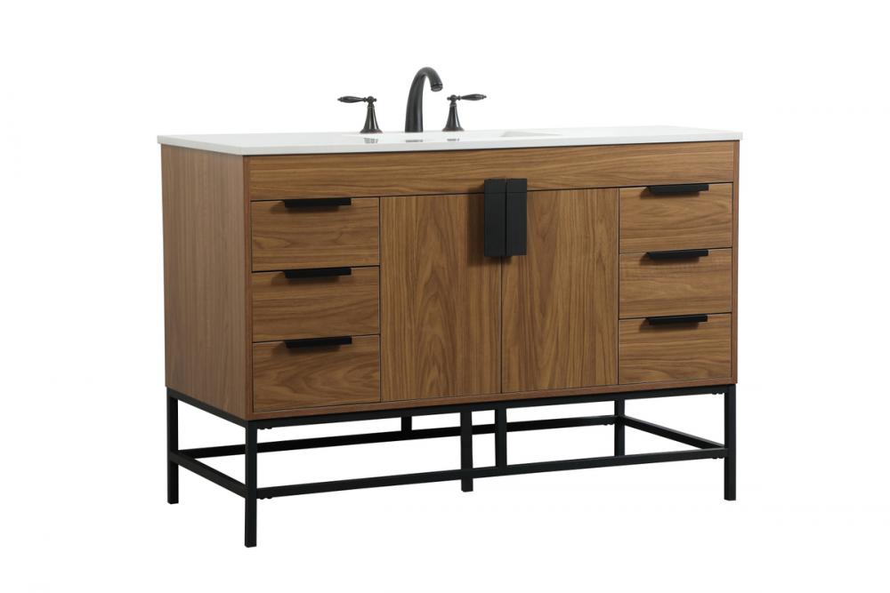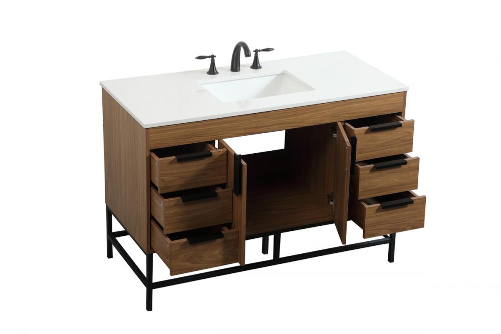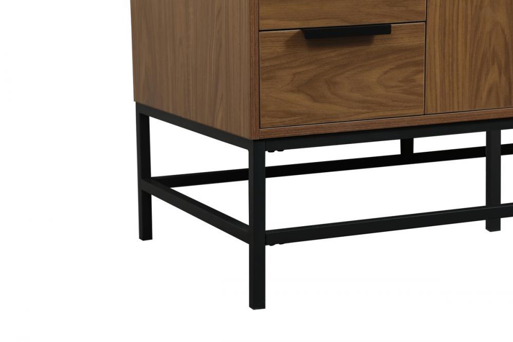 This vanity is a sleek-looking piece of bathroom furniture that is easy to incorporate into your design scheme. The cabinet features a smooth door panel with an oversized steel handle and soft close hinges provide ample room for accessories. Packed with multiple side drawers with soft close glides for added comfort and full access to bath supplies. Constructed of engineered wood, the powder-coated metal rod legs are an urban industrial look that we love. Minor assembly of the metal legs needed to get this vanity up and running. Comes with a matching backsplash to complete the look and protects your wall.