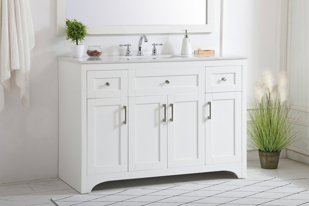 The refined simplicity of this 48" white finish vanity creates a peaceful, yet stylish, atmosphere. Its traditional modernity adds a mature beauty that will elevate any bathroom or powder room--the Calacatta engineered marble counter top adds refined luxe while the brushed nickel handle bars open the 4 cabinet doors and 2 upper drawers, revealing ample storage space to store and hide away an assortment of bathroom essentials. Whether your home is large or small, this vanity will surely fit in well.
