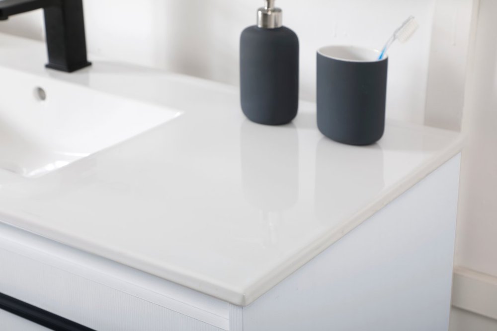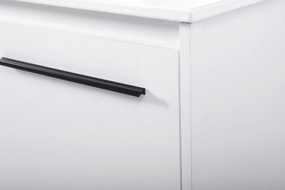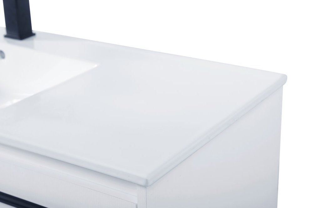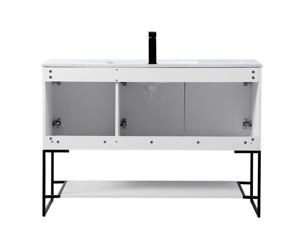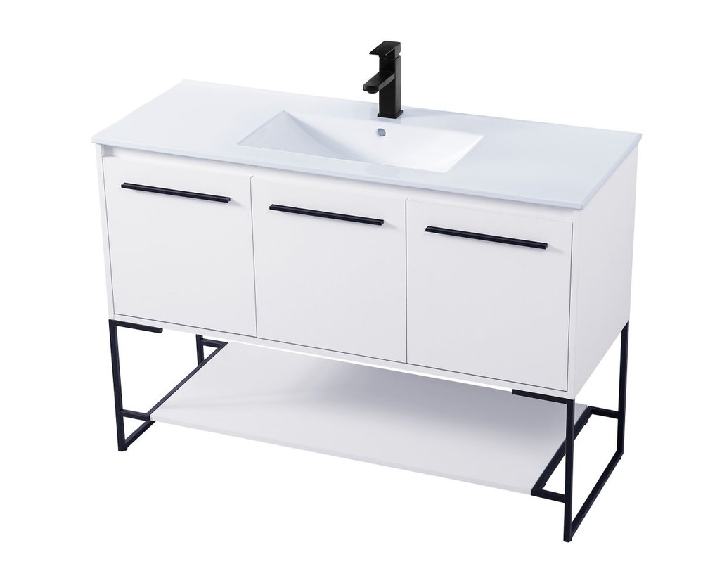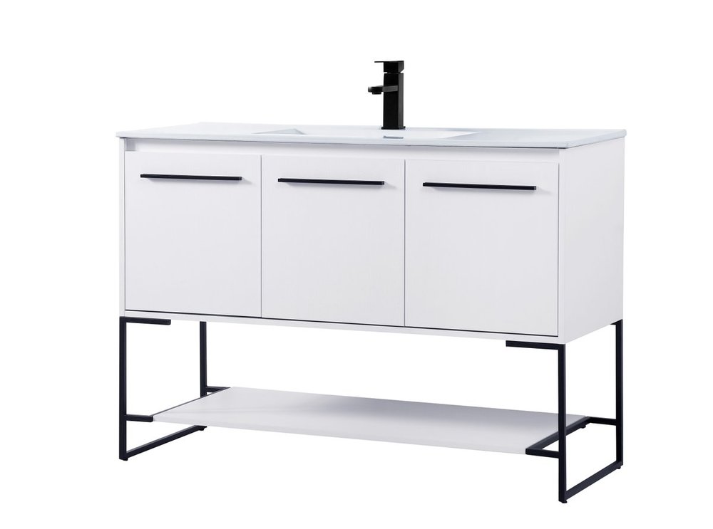 Live in modern comfort with this 48" white finish vanity. Dressed in a concrete grey and sleek black metal hardware, its contemporary style will have your bathroom or powder room elevated in industrial sophistication. The open shelf at the base and 3 doors reveal ample storage space for your bathroom essentials and miscellany. Clean lines create its own visual interest, adding trendy looks to your already chic room.