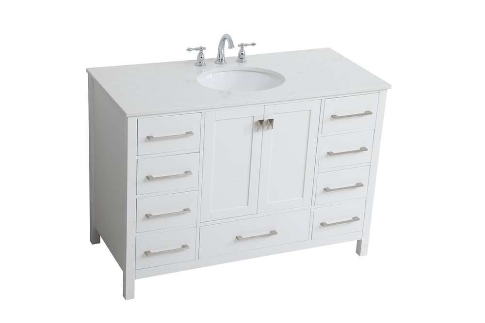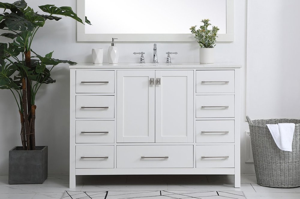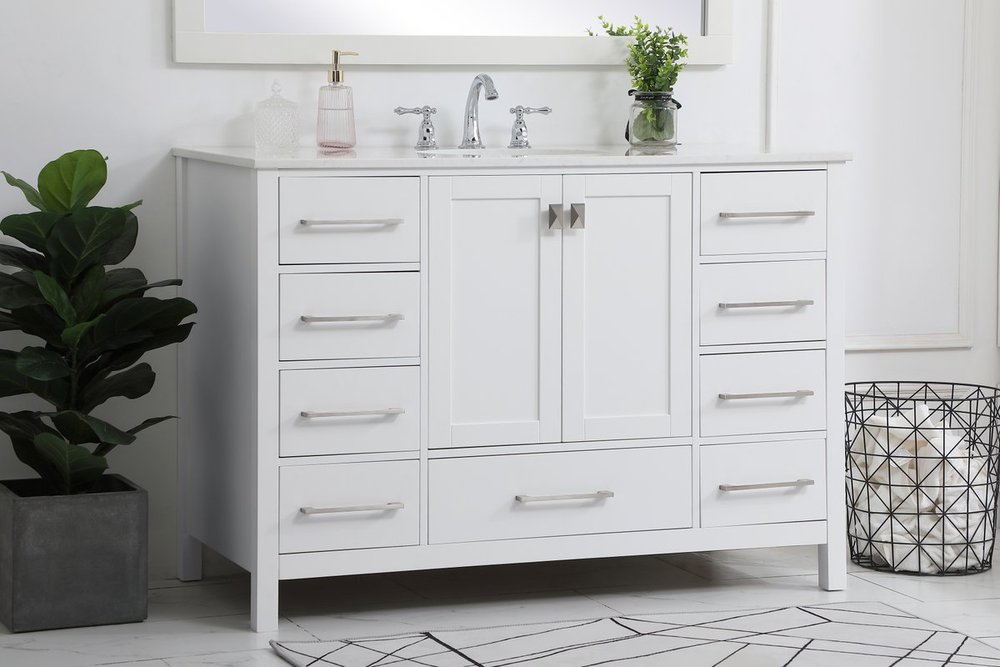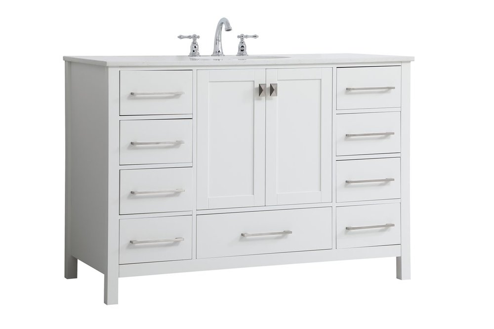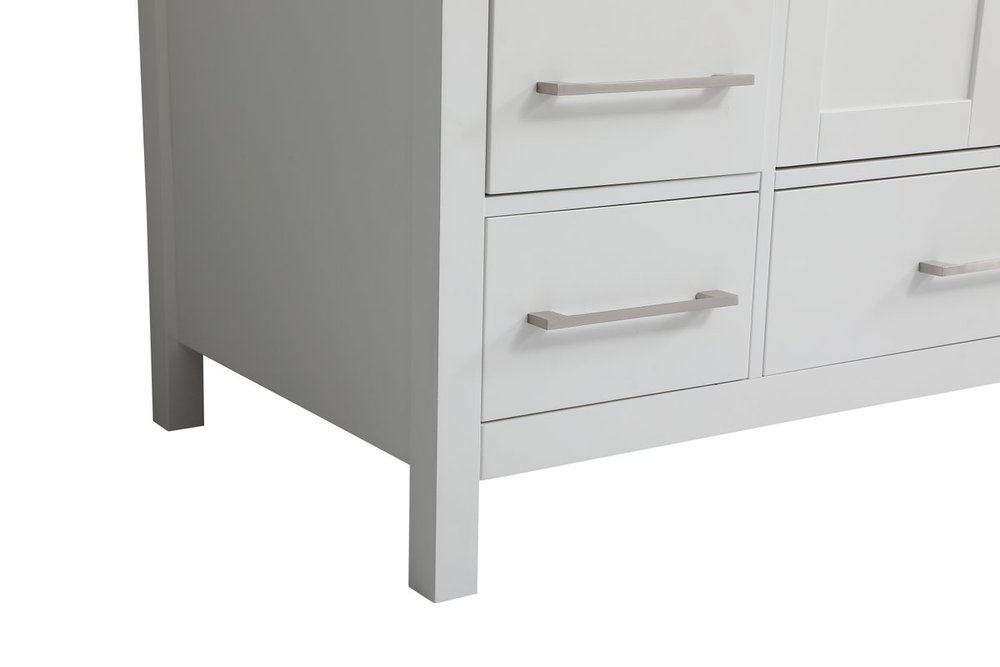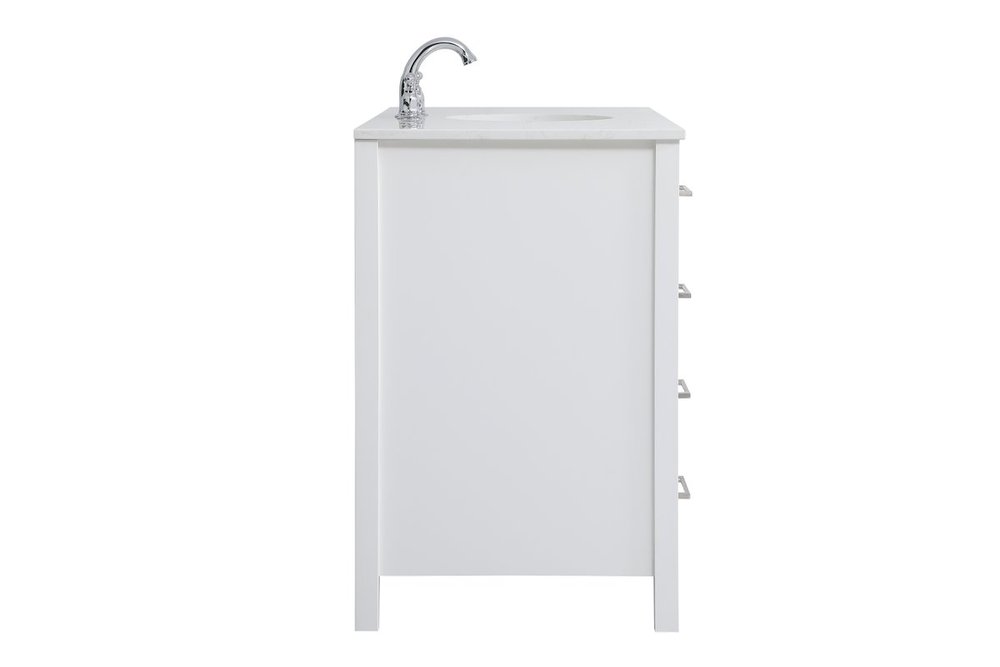 Never compromise beauty--the Irene collection stunning vanity in a white finish will add lovely sophistication and complement any bathroom or powder room, while utilizing its charm and function to provide you with ample storage spaces. Brushed nickel pulls gently adorn the minimalist cabinet doors and drawers at the base, allowing for you to store away your bathroom essentials. The calacatta engineered marble countertop, porcelain undermount sink, dignified subtle engravings on the side edges, and squared legs all come together to create contemporary beauty. Work with your space, and design a beautiful room, no matter the size.
