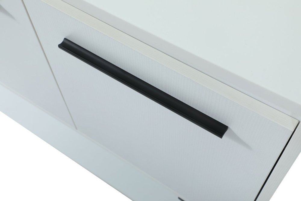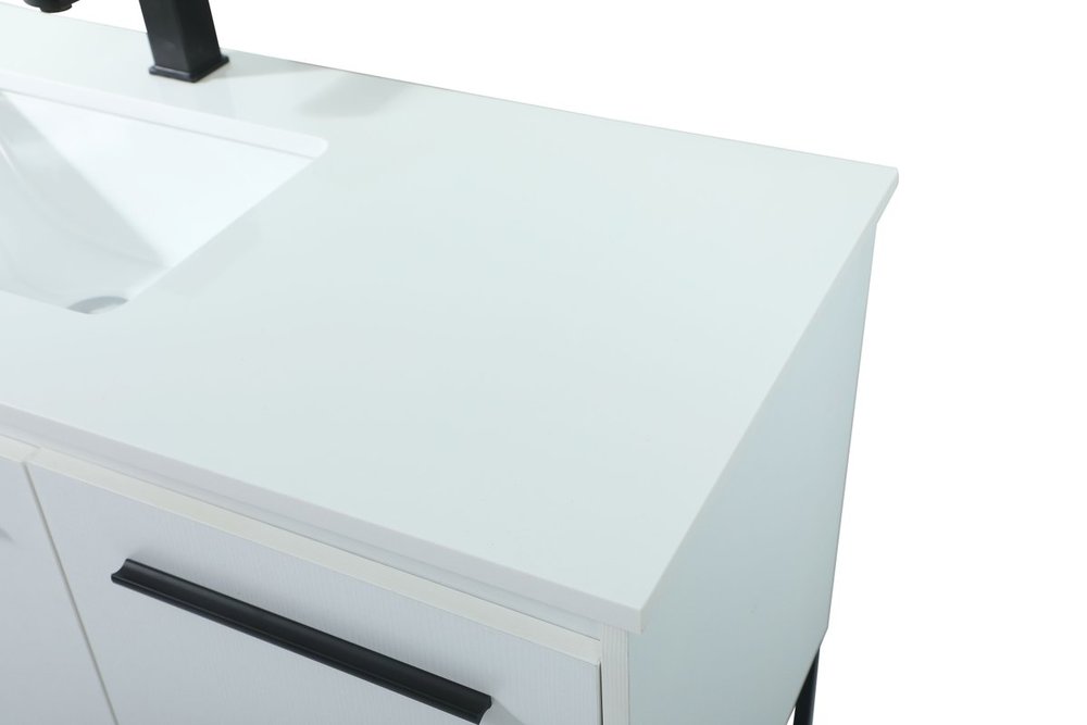 Live in modern comfort with this 48" white finish vanity. Dressed in a white and sleek black metal hardware, its contemporary style will have your bathroom or powder room elevated in industrial sophistication. The open shelf at the base and three doors reveal ample storage space for your bathroom essentials and miscellany. Clean lines create its own visual interest, adding trendy looks to your already chic room.