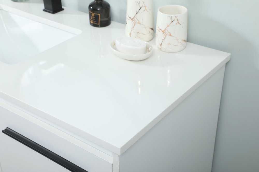 Comes with an undermount porcelain sink and durable ivory white engineered marble stone top