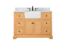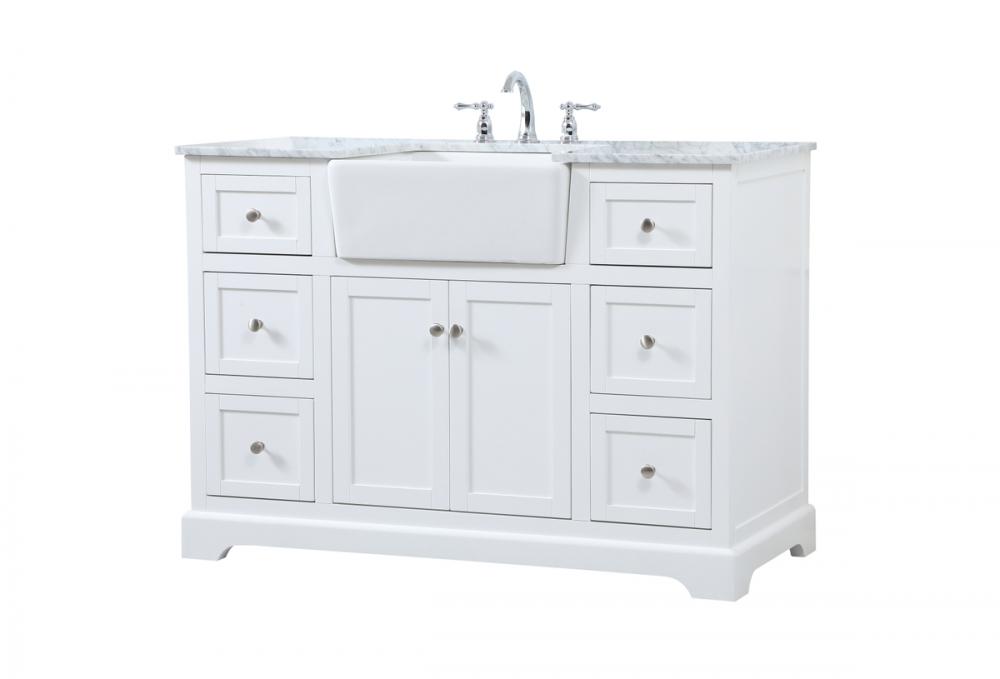 Make the most of your space with this farmhouse style bathroom vanity. Complements well with its beautiful finish, carrara white marble countertop, and the contemporary slender handle bar that sits on the functional drawers with soft closing mechanism, allowing you to store an assortment of bathroom essentials. The lower shelf makes it the perfect space to hold new towels for your guests. This stylish vanity ensures both form and function in your bathroom for you and your guests.
