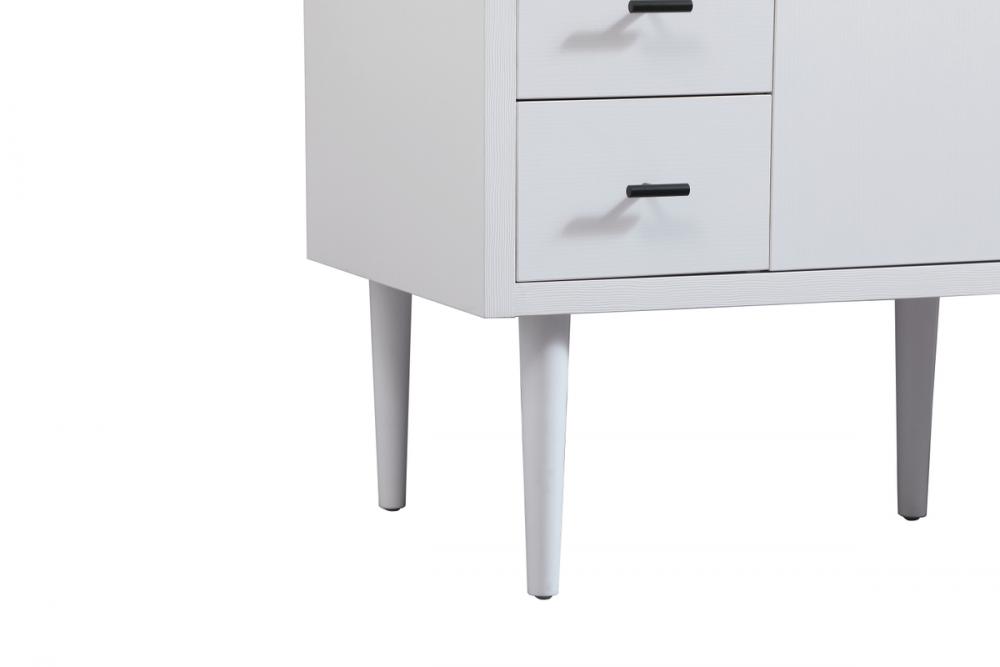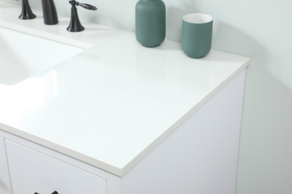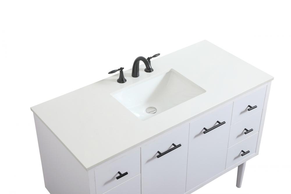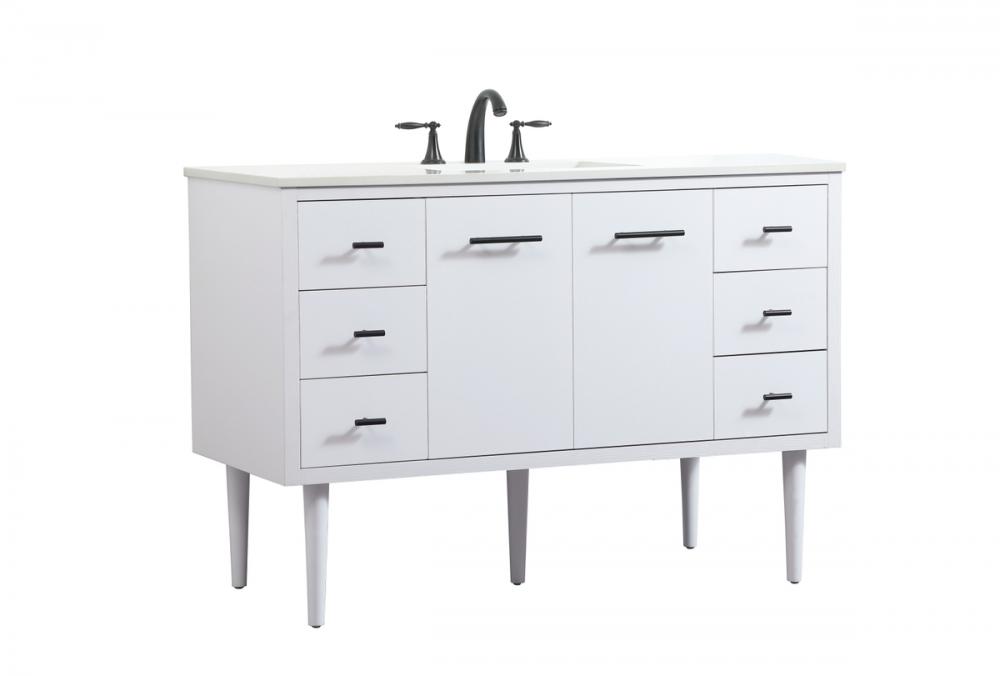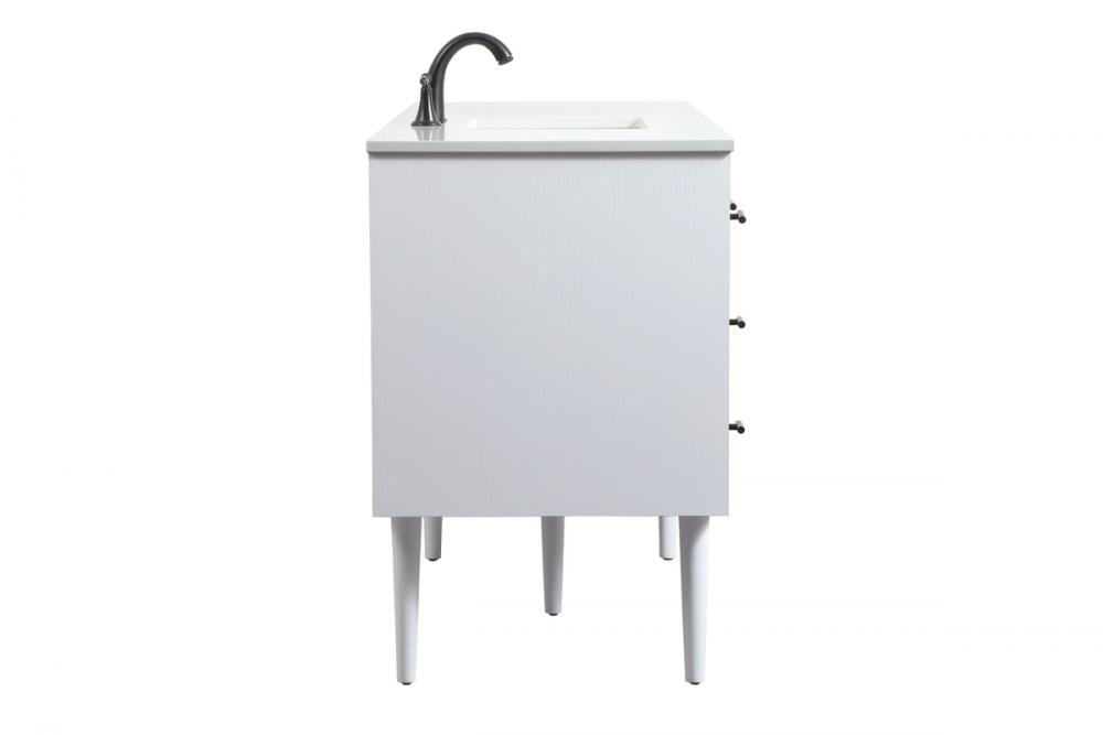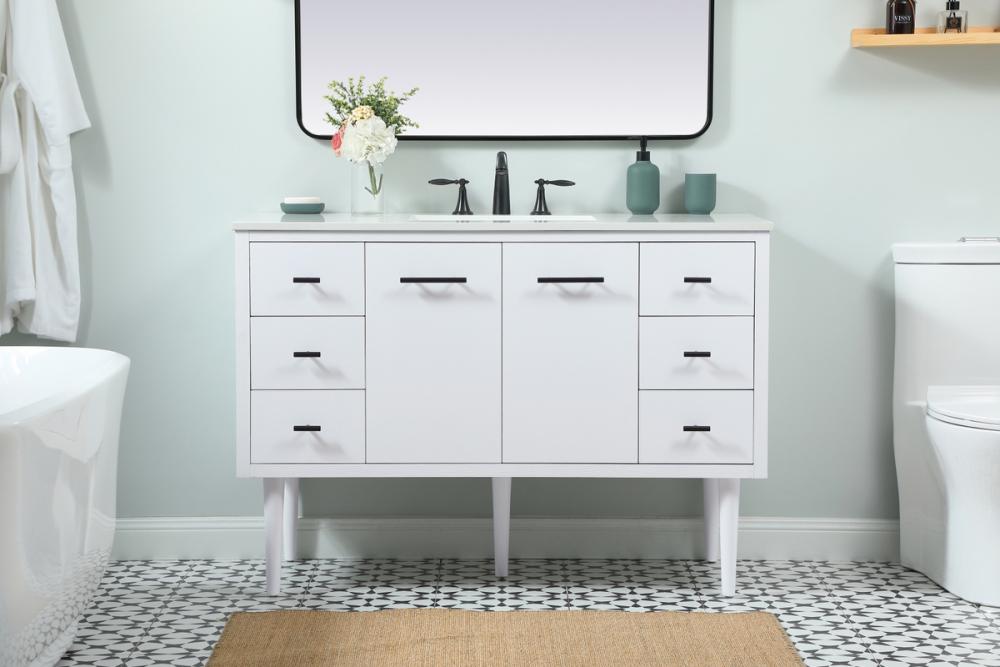 Delve into a world of minimalistic fashion and contemporary styling with this midcentury modern vanity. The clean lines anchors the design, while the straight tapered cylinder legs add subtle interest. Bar pull handle adorns the soft closing door hiding the base of the rectangular porcelain sink and letting you store your bathroom necessities and toiletries. Six soft closing drawers add plenty of storage option. Whether you want to use this as a floating vanity or a freestanding vanity, the choice is yours. The durable ivory white engineered marble countertop complements the manufactured wood base vanity and is built to last.