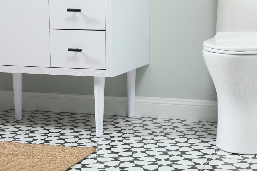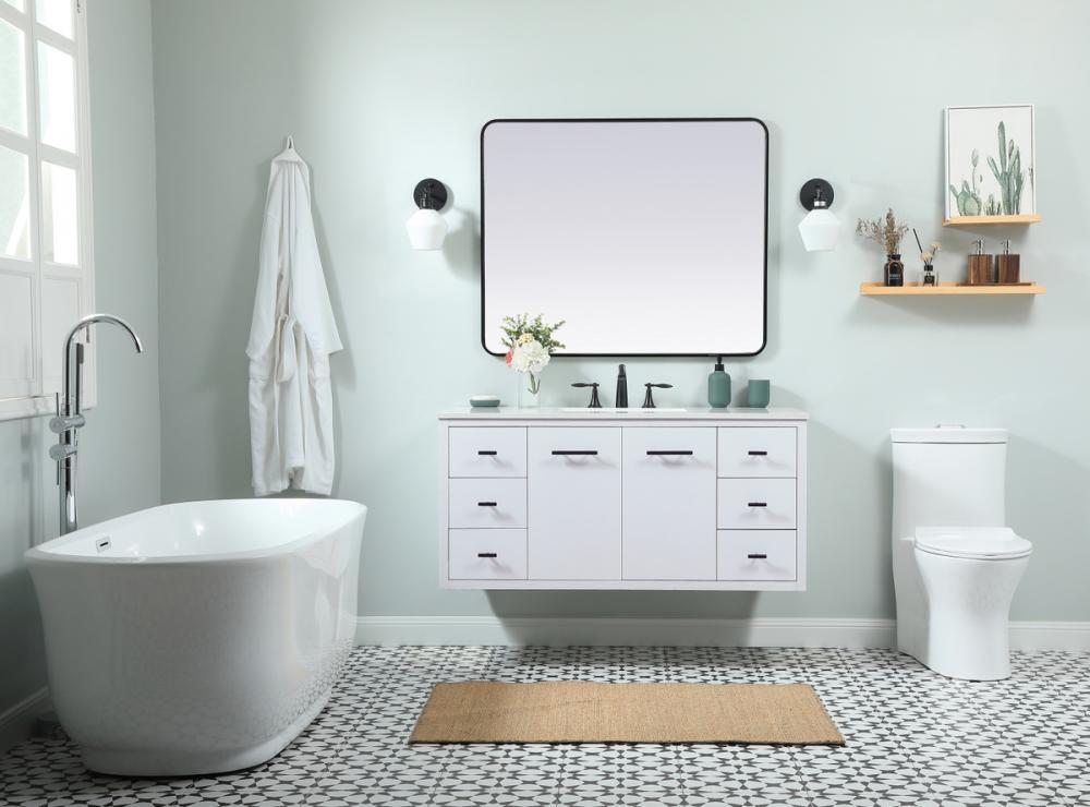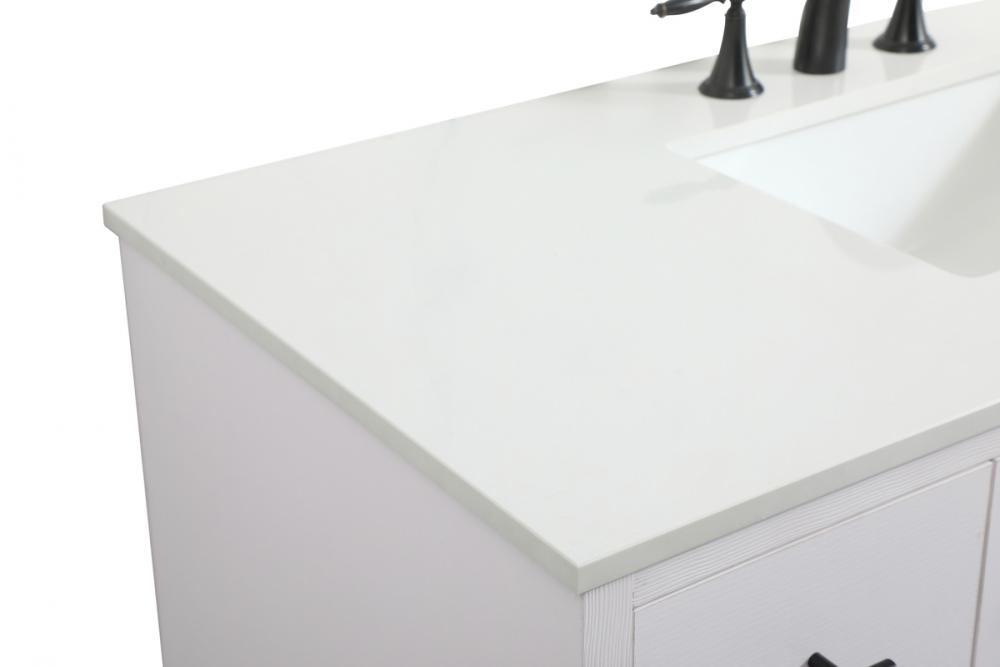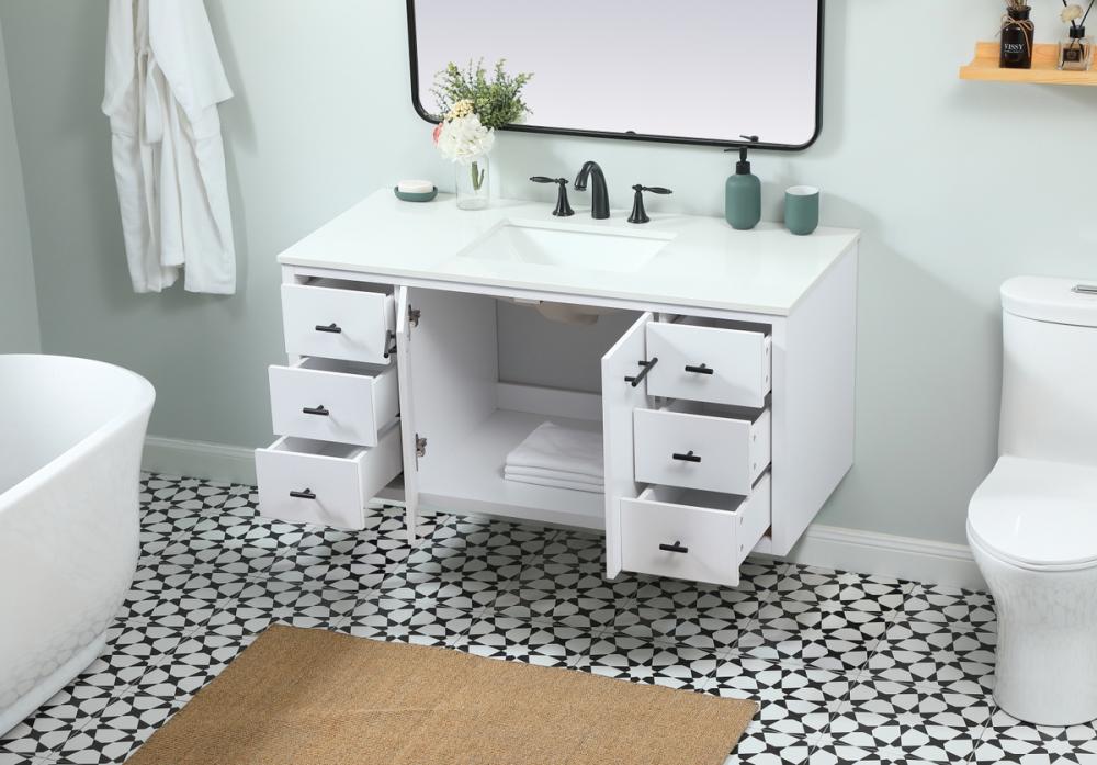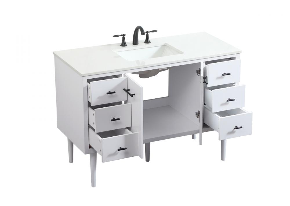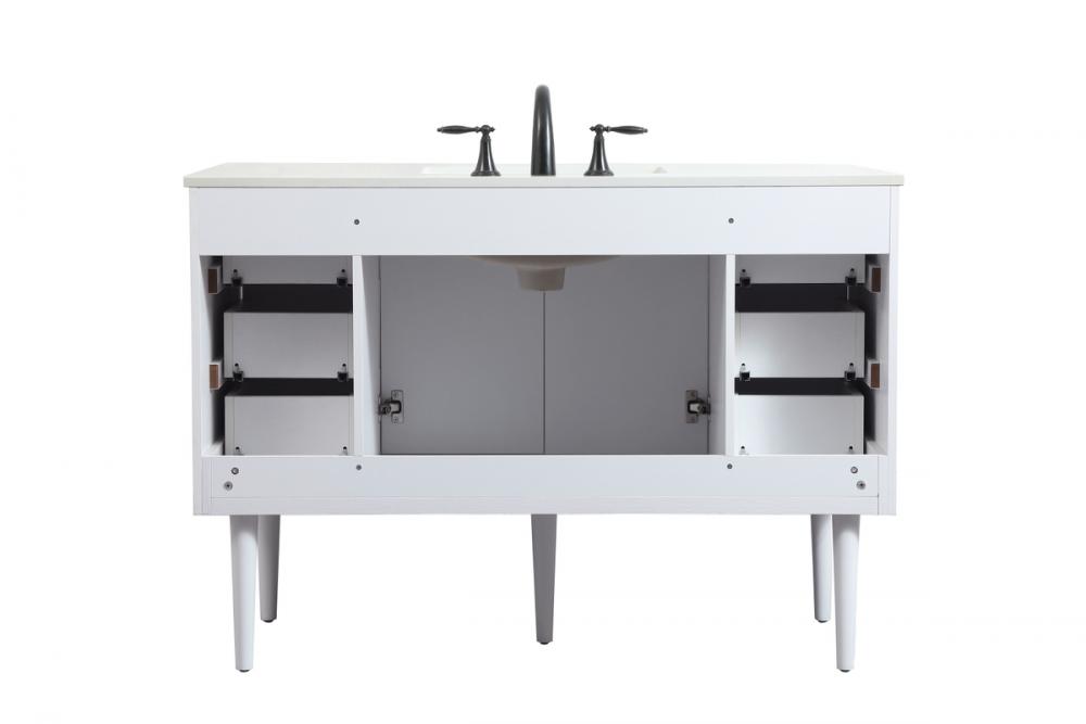 Delve into a world of minimalistic fashion and contemporary styling with this midcentury modern vanity. The clean lines anchors the design, while the straight tapered cylinder legs add subtle interest. Bar pull handle adorns the soft closing door hiding the base of the rectangular porcelain sink and letting you store your bathroom necessities and toiletries. Six soft closing drawers add plenty of storage option. Whether you want to use this as a floating vanity or a freestanding vanity, the choice is yours. The durable ivory white engineered marble countertop complements the manufactured wood base vanity and is built to last.