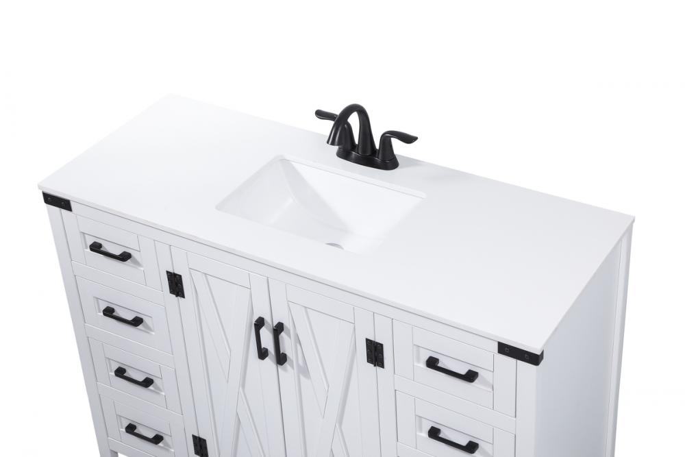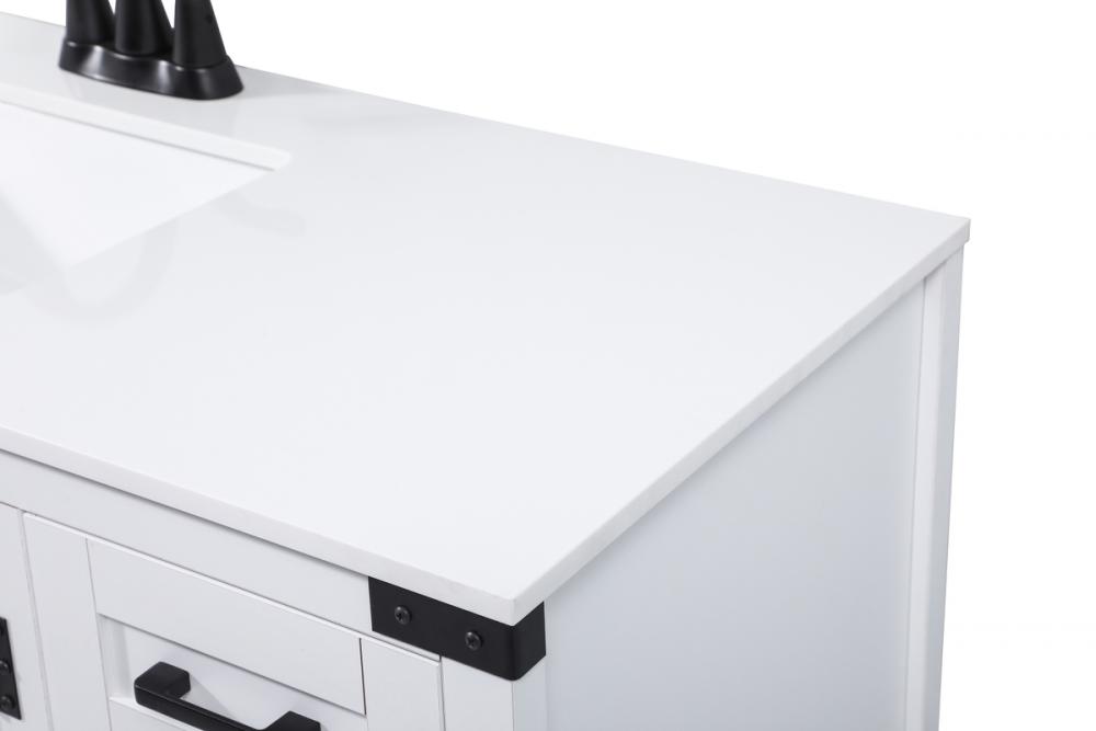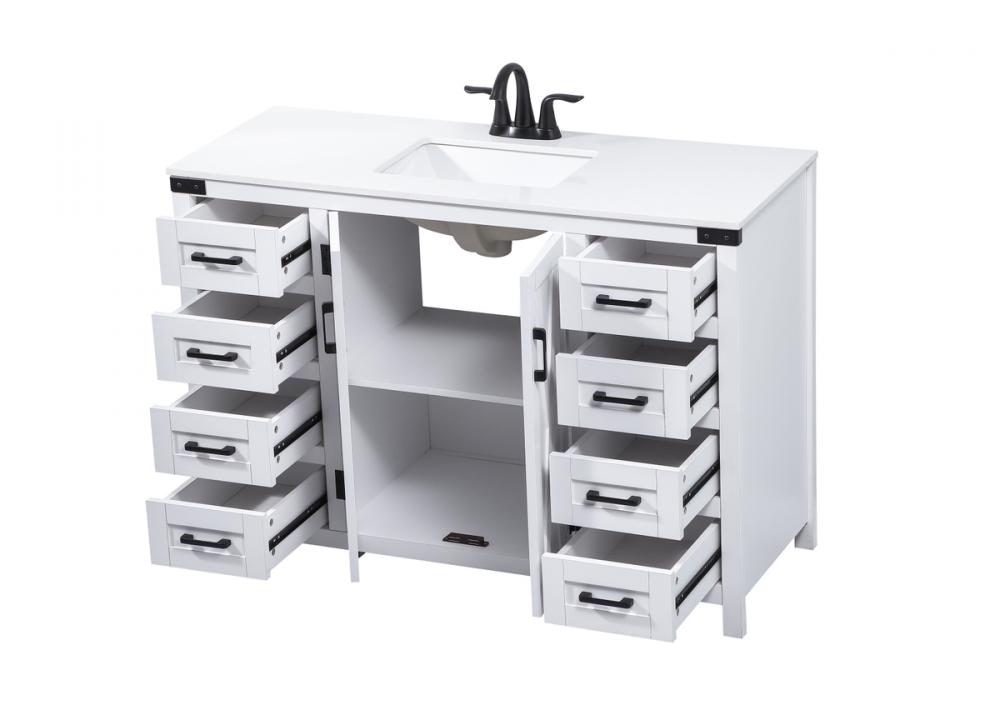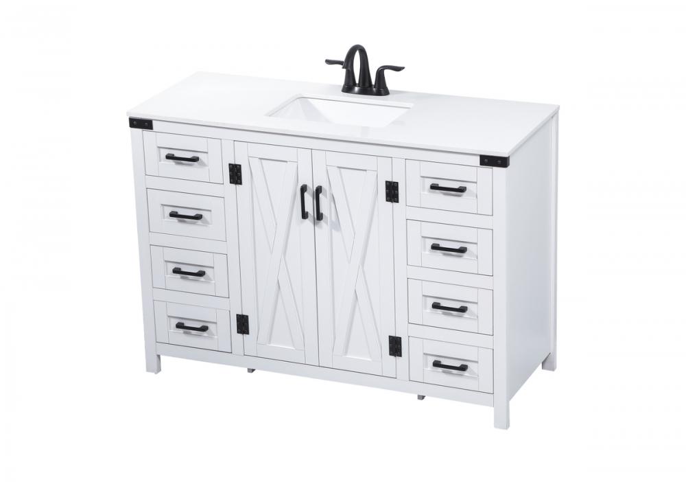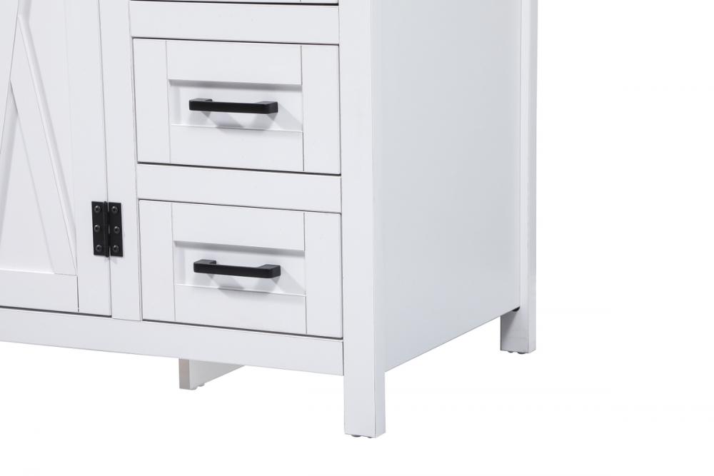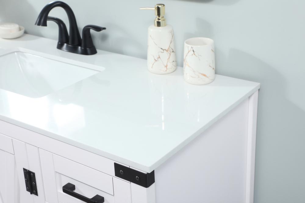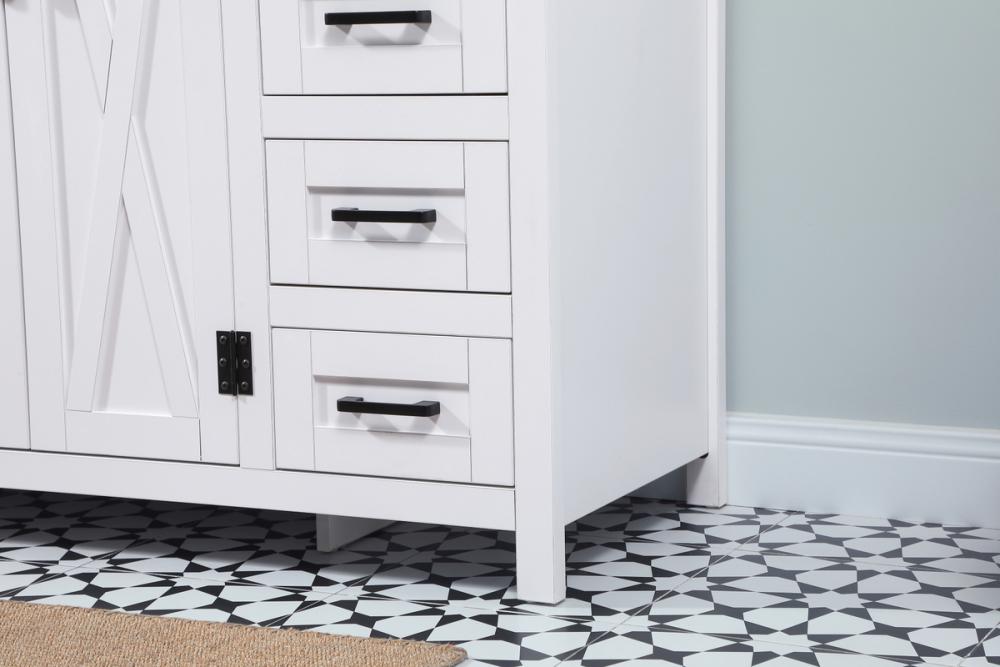 Reminiscent of barn doors, the two door cabinet and eight drawers adds both stylistic charm and function with its plethora of storage options for all your bathroom essentials. Whether for your bathroom or the guests', everyone will marvel at its classic look for traditional and farmhouse aesthetics. A slab of engineered marble rounds out the piece up top, as well as the porcelain under mount sink and predrilled faucet holes. This vanity arrives fully assembled.
