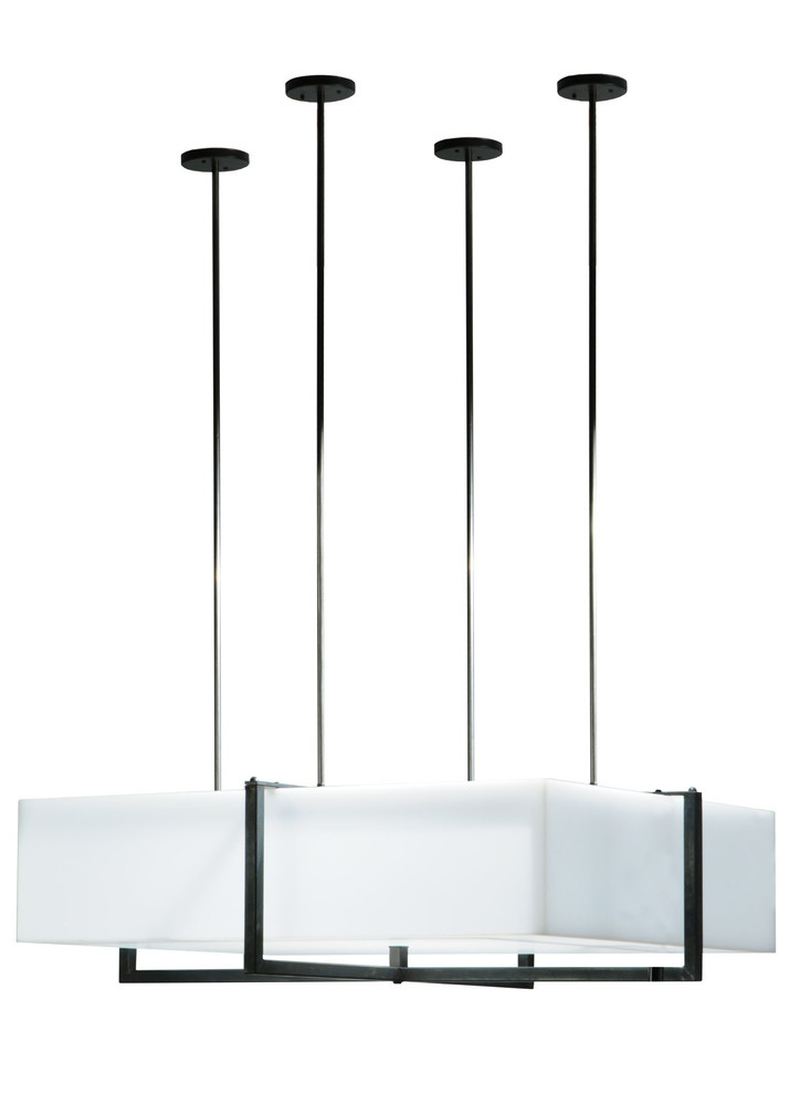 Extraordinary custom luminaires are created from our broad palette of custom options to satisfy the most challenging aesthetic and functional demands of your lighting project. Quadrato Brew Pendant does not include electrification as it was installed below an existing original high bay lighting fixture in Stone Brewing World Bistro & Gardens; operated by a leading microbreweries and based in San Diego County. We model illuminance specifications and dimmable lamping options; to meet your requirements. Handcrafted in Yorkville; NY; the Pendant features a linear Statuario Idalight diffuser with Natural Steel hardware and frame.