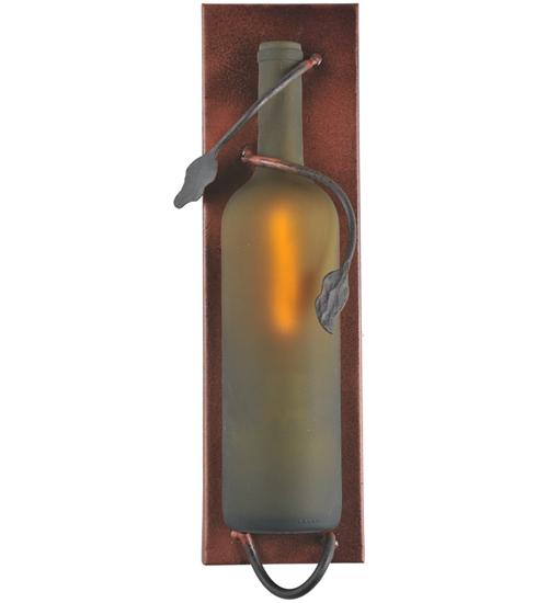 Designed for the connoisseur who will appreciate the detail and vintage appeal of this charming pocket wall sconce; a hand forged Black Cherry vine and leaf coil is designed around the neck of this stunning Frosted Green Wine Bottle. The backplate is hand finished in Copper Metallic. The fixture does so much more than deliver light; it adds personality and pizazz to any interior and is perfect for homes; restaurants; hotels; pubs; nightclubs; wineries; and retailers. Handcrafted in the USA by Meyda artisans; the fixture is offered in custom styles; colors and sizes are available. Energy efficient lamping options are offered. UL and cUL listed for damp and dry locations.