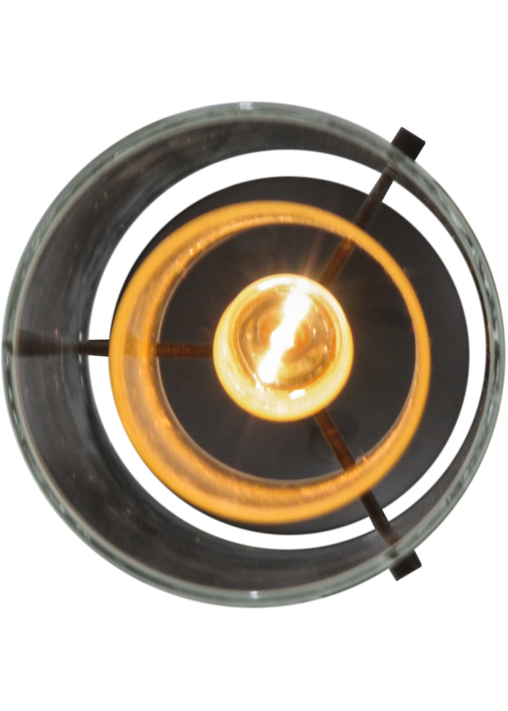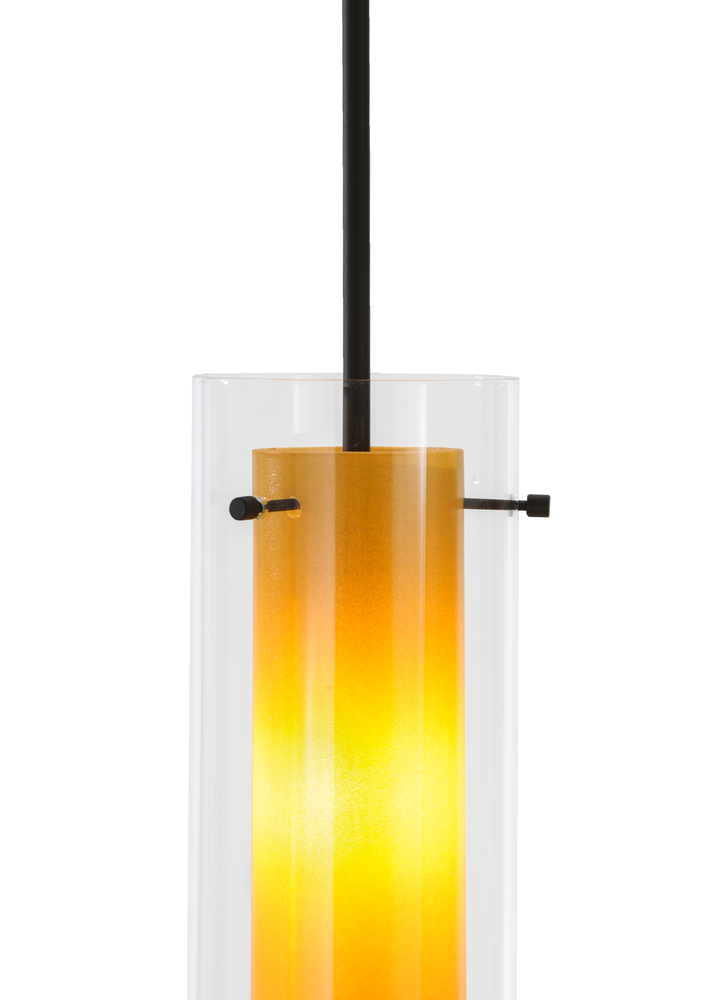 A stunning modern look for today's interiors. An Amber Art Glass cylinder is revealed within a larger Clear Glass Cylinder for a unique shade-in-shade lighting design. This innovative fixture is enhanced with an Oil Rubbed Bronze finish. These mini pendants can be installed above an island; counter; bar or table to make a dramatic design statement. The Cilindro Agoura Mini Pendant is featured in our American made; American designed handcrafted Contemporary Lighting Collection. Manufactured in Yorkville; New York. UL and cUL listed for dry and damp locations.