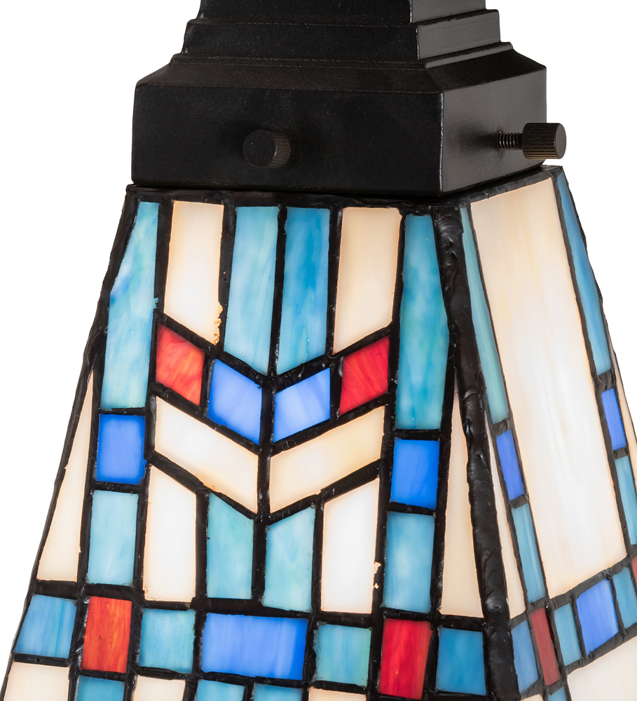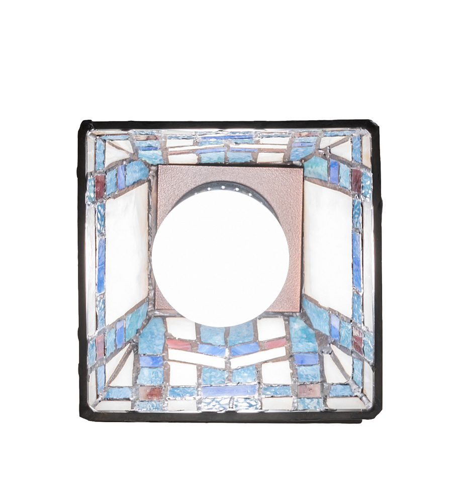 In the tradition of the Prairie School architectural style; organic objects were interpreted into geometric forms. In this wall sconce; we use colorful interlocking blocks of multi-colored glass in hues of blue/green with accent blocks of blue and burgundy to form stylized wheat stalks on a Beige Cream background The handcrafted art glass shade is created using the famous Meyda Tiffany copperfoil construction process. Pair the shade with a base to create a stunning table lamp or with hardware to build a beautiful ceiling fixture. Each shade is a unique work of art with color variations based on natural ingredients inherent in the glass. Contact us if color matching is critical when ordering multiple items.