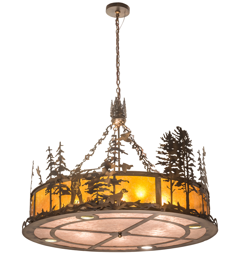 A striking image of a sportsman with a Dog hunting Quail in the woods while the morning sun rises in the background. The scene is enhanced with a stand of Tall Pine Tree metal silhouettes. Beautiful ambient light projects through an inverted Amber Mica shade which is enhanced with a Silver Mica bottom diffuser featuring four downlights for task illumination. The stunning shade is complemented with a frame and hardware featured in Dark Burnished Antique Copper finish. Overall height ranges from 41 to 71 inches as the chain can be easily adjusted in the field. The Quail Hunter W/Dog Pendant is featured in our American made; American designed handcrafted Rustic Lighting Collection. UL and cUL listed for dry and damp locations.