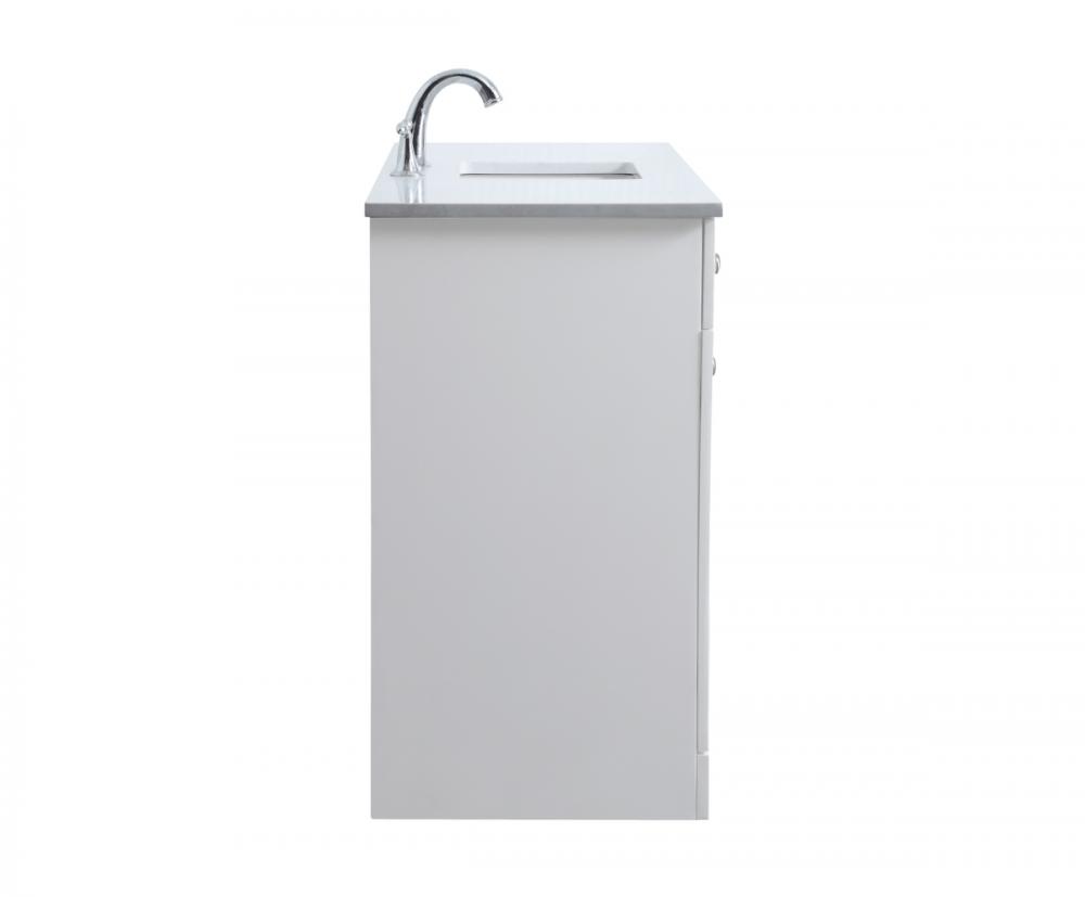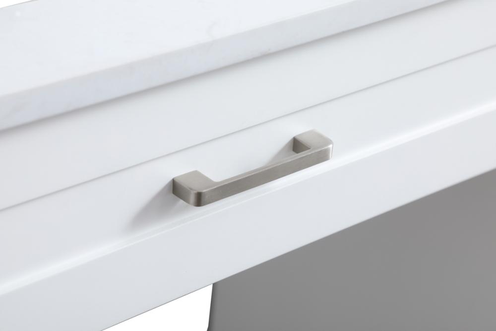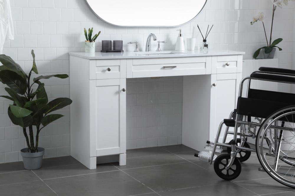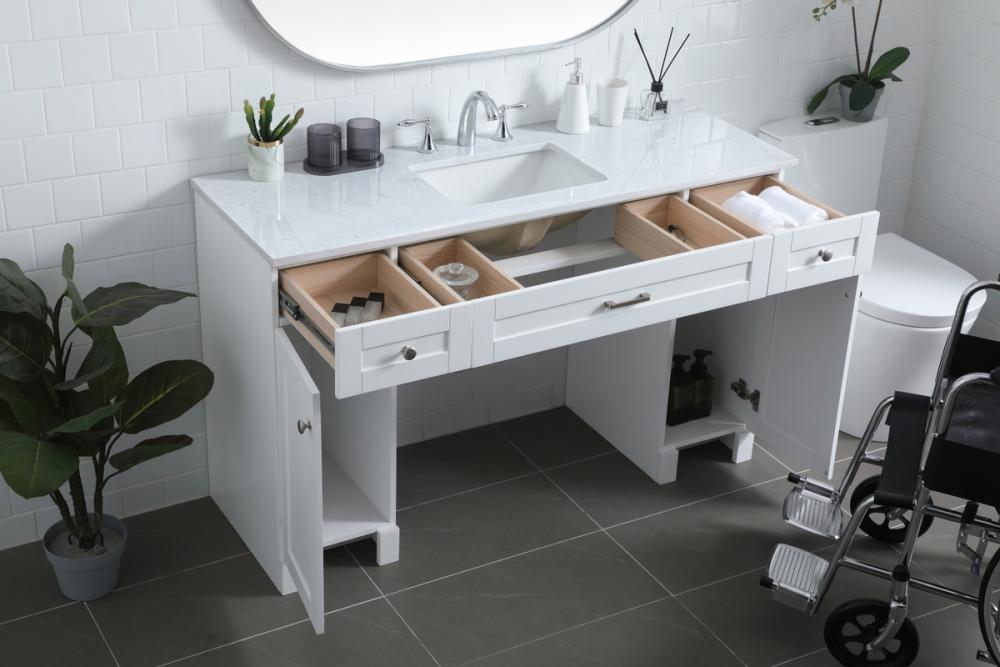 Step into a bathroom oasis that redefines inclusivity and elegance with our Handicap ADA Compliant Bathroom Vanity. Designed with careful consideration for accessibility, this vanity accommodates wheelchair access effortlessly. The undermount porcelain sink, set upon a durable Calacatta look engineered marble stone top, brings an air of opulence to your space. Customize your vanity with the versatile predrilled countertops, allowing you to choose faucets that suit your taste. The soft closing drawers ensure a serene and peaceful environment, complemented by the fully assembled and ready-to-use design for instant gratification. The optimal knee clearance and discreetly placed overflow hole in the porcelain sink further enhance the functionality of this vanity. With three functional drawers, two cabinets, and stainless steel knobs, organization and aesthetics seamlessly intertwine. Choose our Handicap ADA Compliant Bathroom Vanity for a space that embodies accessibility without compromising on luxury. Redefine your daily rituals with a vanity that caters to everyone's needs while adding a touch of sophistication to your bathroom sanctuary.