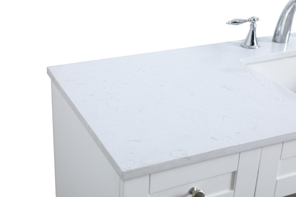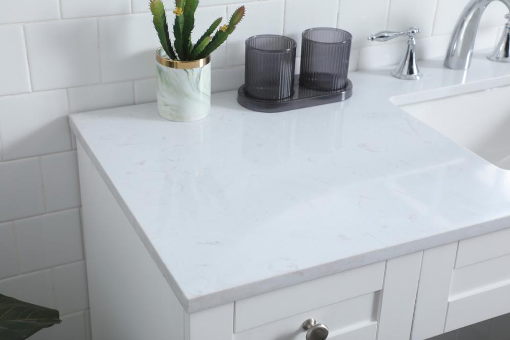 Immerse yourself in luxury with the undermount porcelain sink, elegantly paired with a durable Calacatta look engineered marble stone top. This combination not only exudes sophistication but also promises lasting durability.