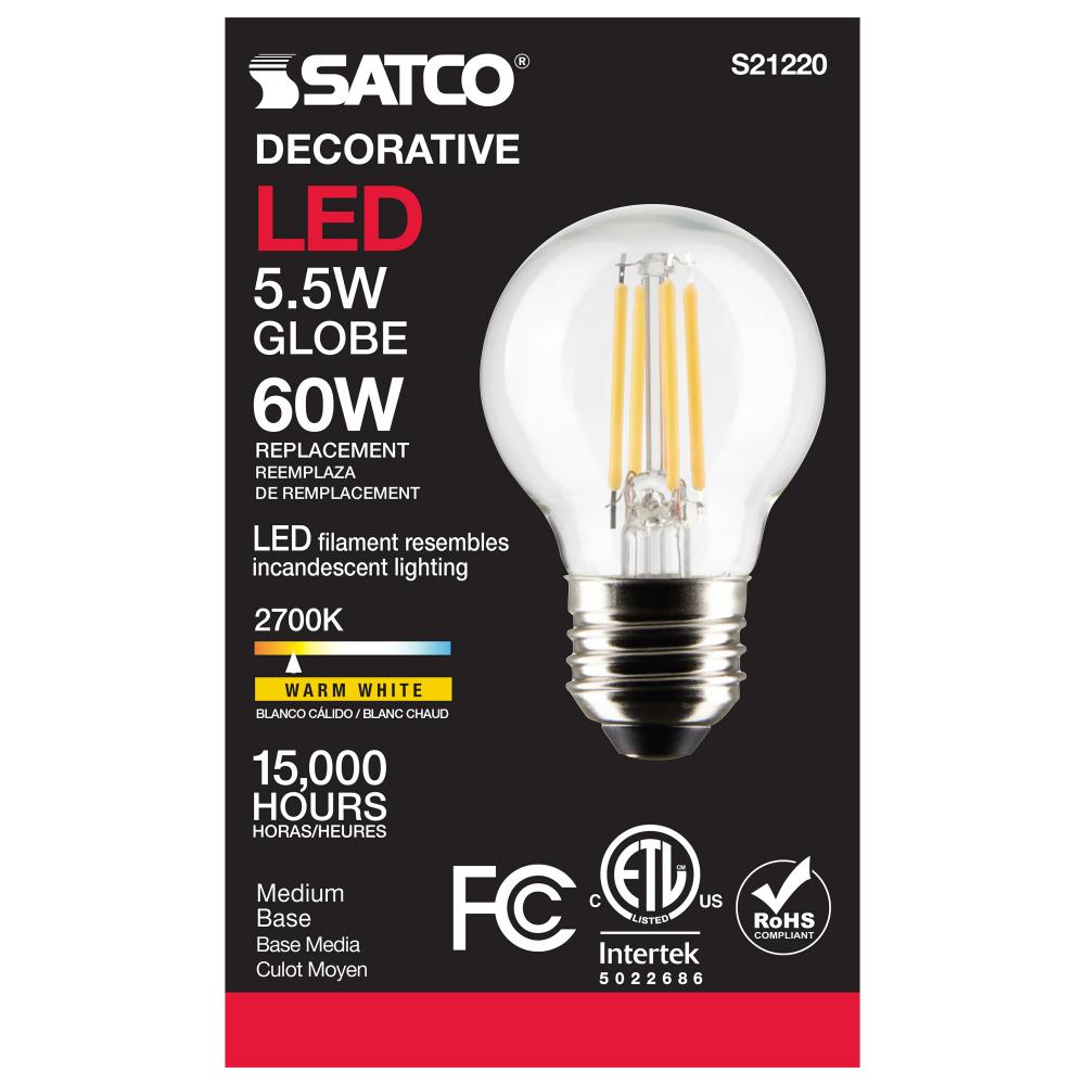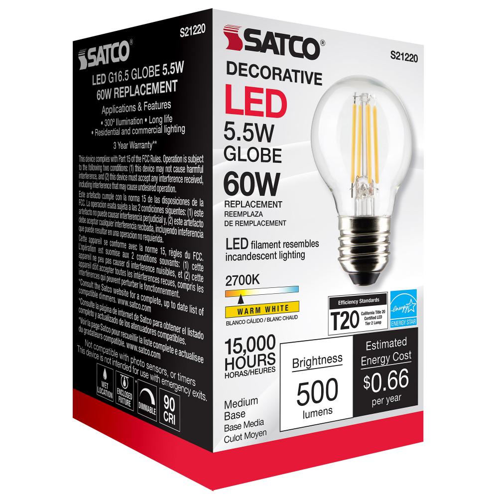Satco's 5.5-watt LED lamp is traditional, yet contemporary with its vintage style and energy saving LED technology. Elegantly illuminate any room in the house with this dimmable, globe shaped bulb. Sophisticated and modern, this lamp delivers 15,000 ho