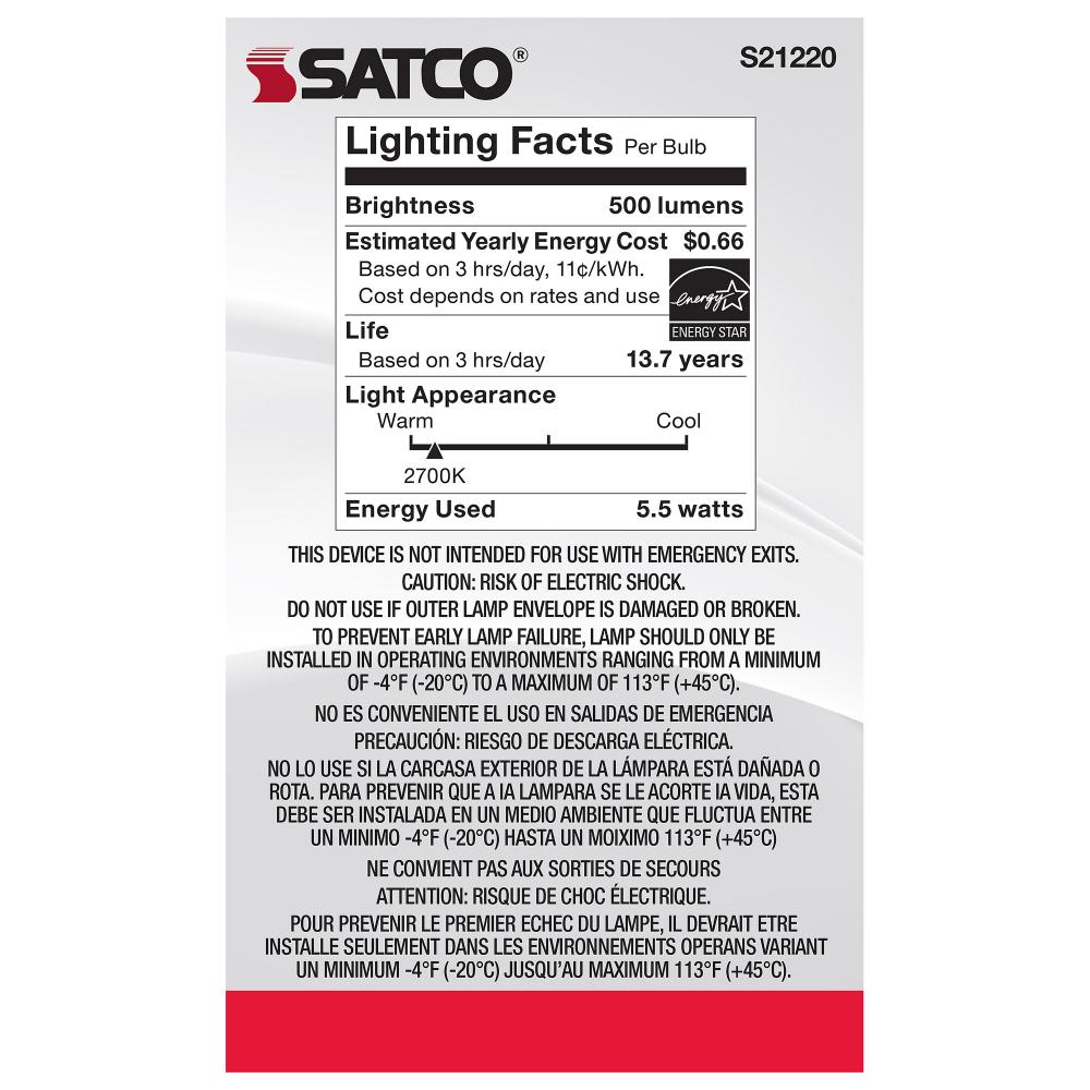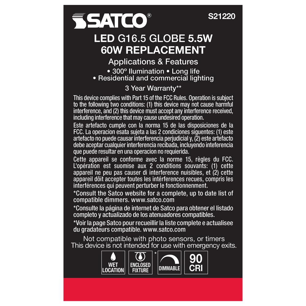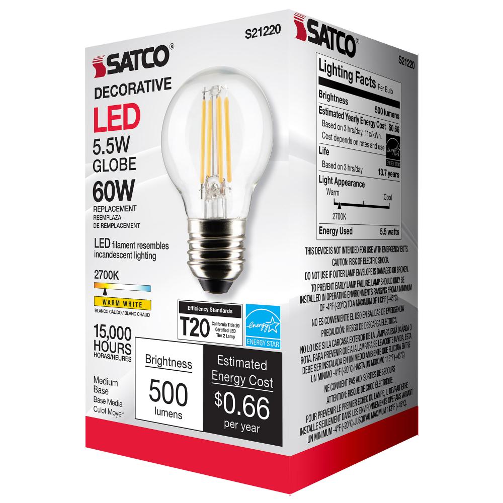 Satco's S21220 5.5-watt LED lamp is traditional, yet contemporary with its vintage style and energy saving LED technology. Elegantly illuminate any room in the house with this dimmable, globe shaped bulb. Sophisticated and modern, this lamp delivers 15