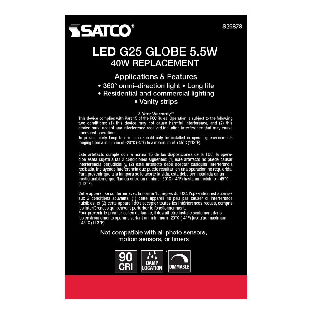 Satco's S29878 5.5-watt LED lamp is traditional, yet contemporary with its sleek finish and energy saving LED technology. Elegantly illuminate any room in the house with this dimmable, globe shaped bulb. Sophisticated and modern, this lamp delivers 15,