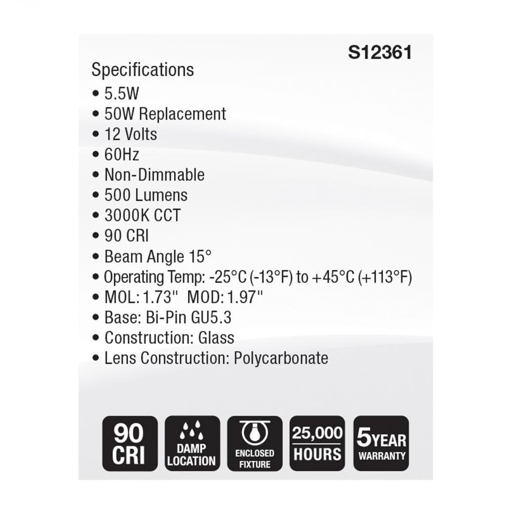 SATCO MR16 lamps are available with GU5.3 and GU10 bases, for versatile lighting solutions in 12V and 120V applications. These lamps are offered in a wide range of color temperatures, from a warm 2700K, to a bright 6500K, and provide high color accuracy wi