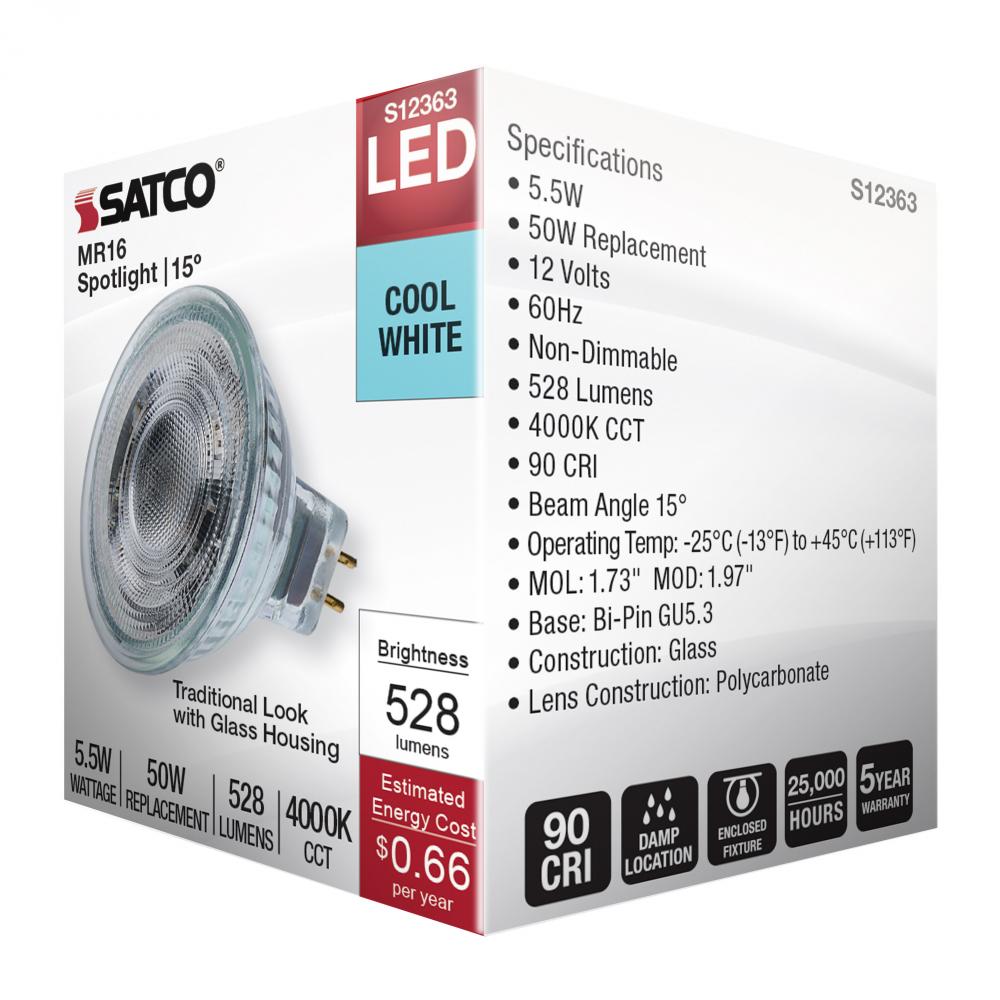 SATCO S12363 MR16 lamps provide high color accuracy with a 90 CRI and are dimmable for customizable lighting. These lamps are also damp location rated, and suitable for use in enclosed fixtures. Perfect for a variety of residential and commercial applicati