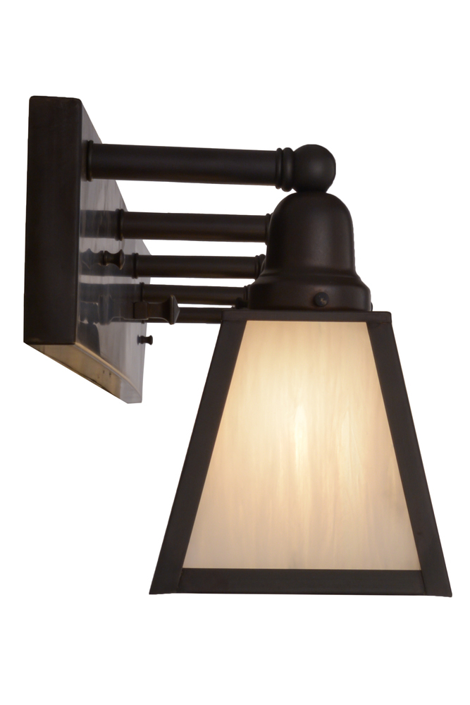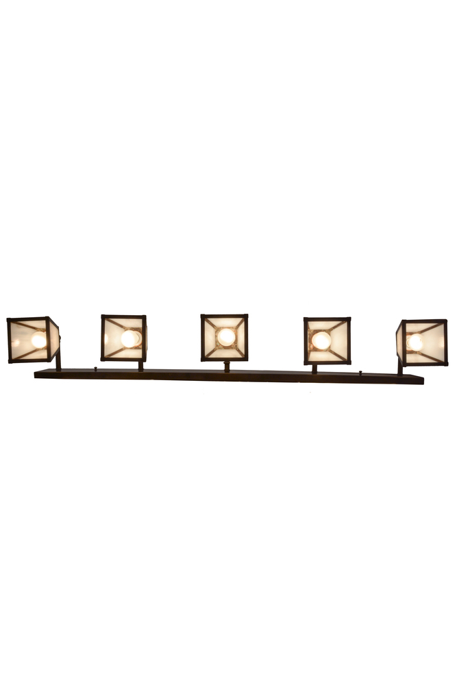 An impressive linear Mission design; five White art glass shades with straight line profiles are embraced by steel hardware featured in a warm Craftsman Brown finish. The fixture is ideal as a vanity light to illuminate baths or a sconce used in corridors. This fixture is custom crafted by Meyda artisans in Upstate New York. Custom sizes; styles; colors and dimmable; energy-efficient lamping options are available.